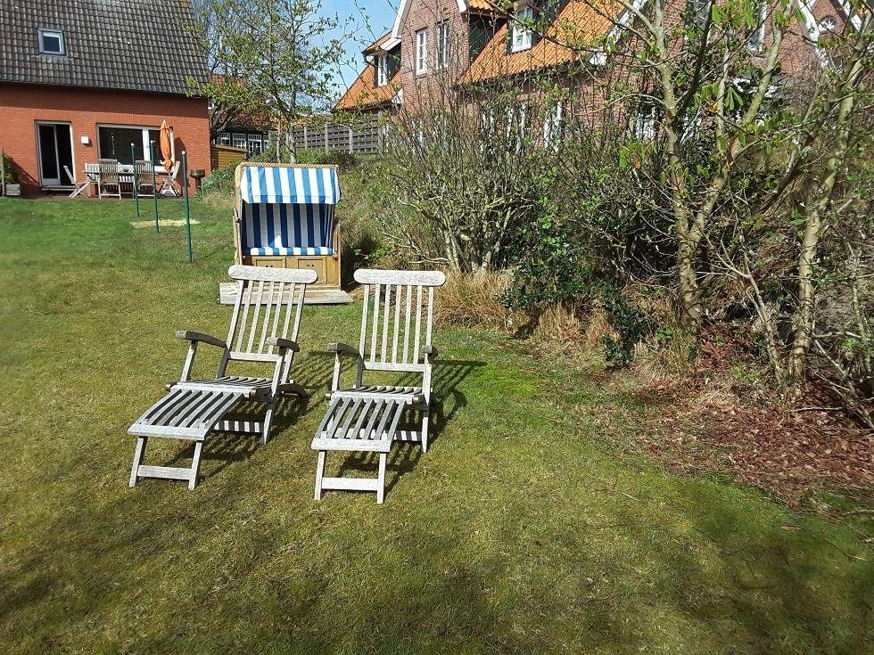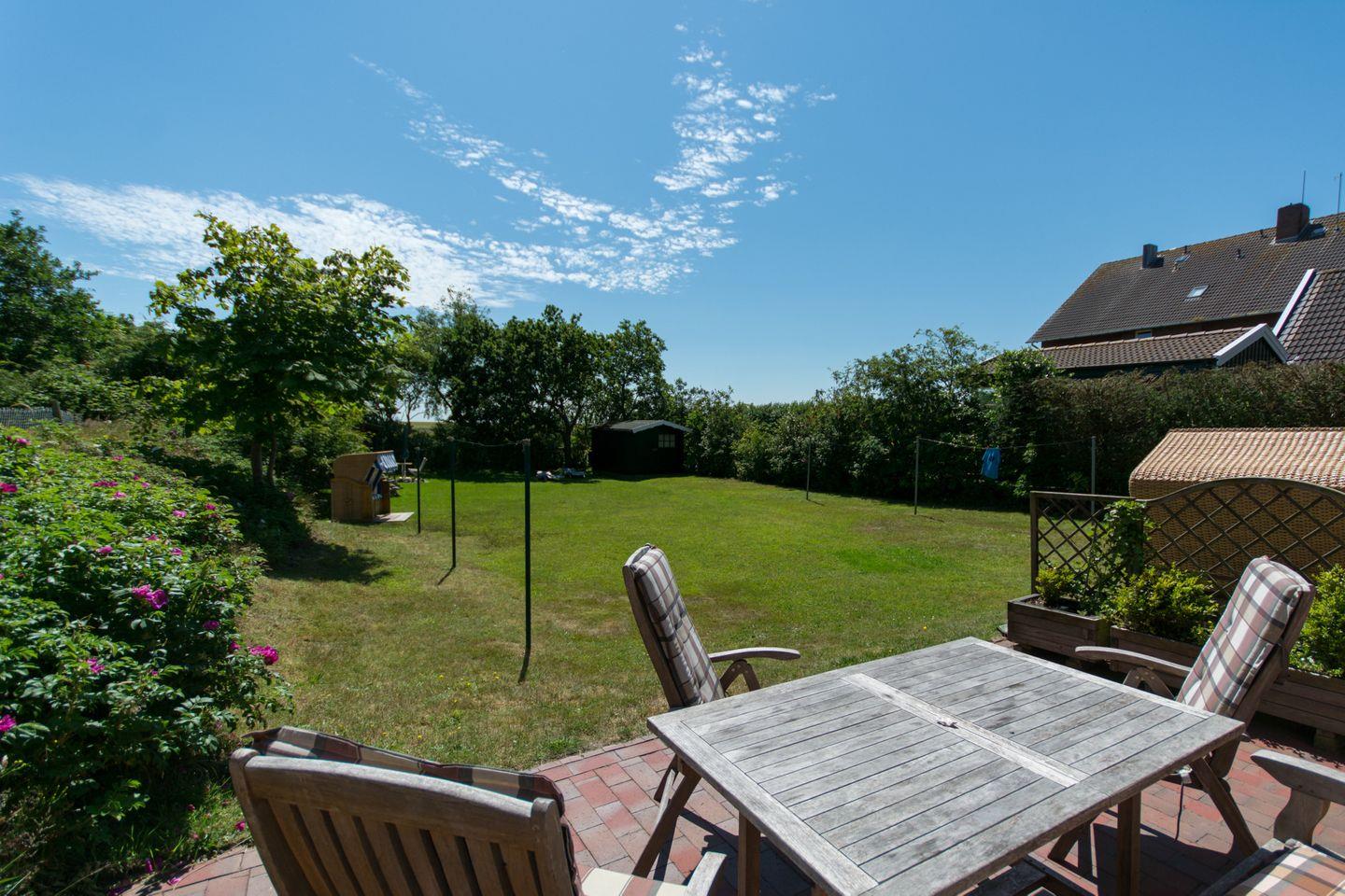 Zur wertvollen Auszeit an der frischen Nordseeluft trägt die großzügige Süd-Terrasse bei, die mit Gartenmöbeln und einem Strandkorb ausgestattet ist. Hier haben Sie die Möglichkeit, die entspannte Insellage bei einem Frühstück oder am Nachmittag zu genießen. Für den bequemen Transport von Strandutensilien oder Einkäufen steht ein Bollerwagen zur Verfügung.
