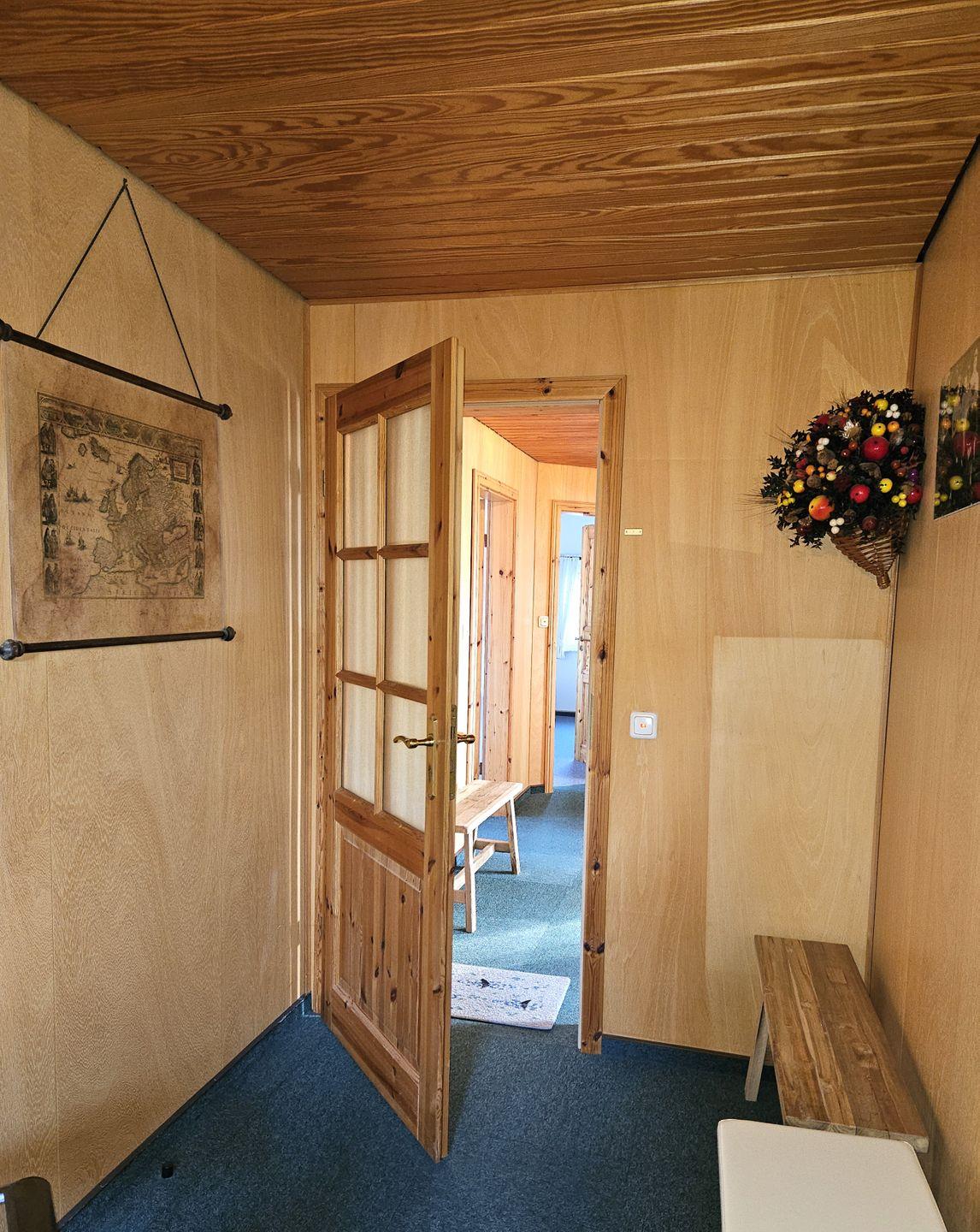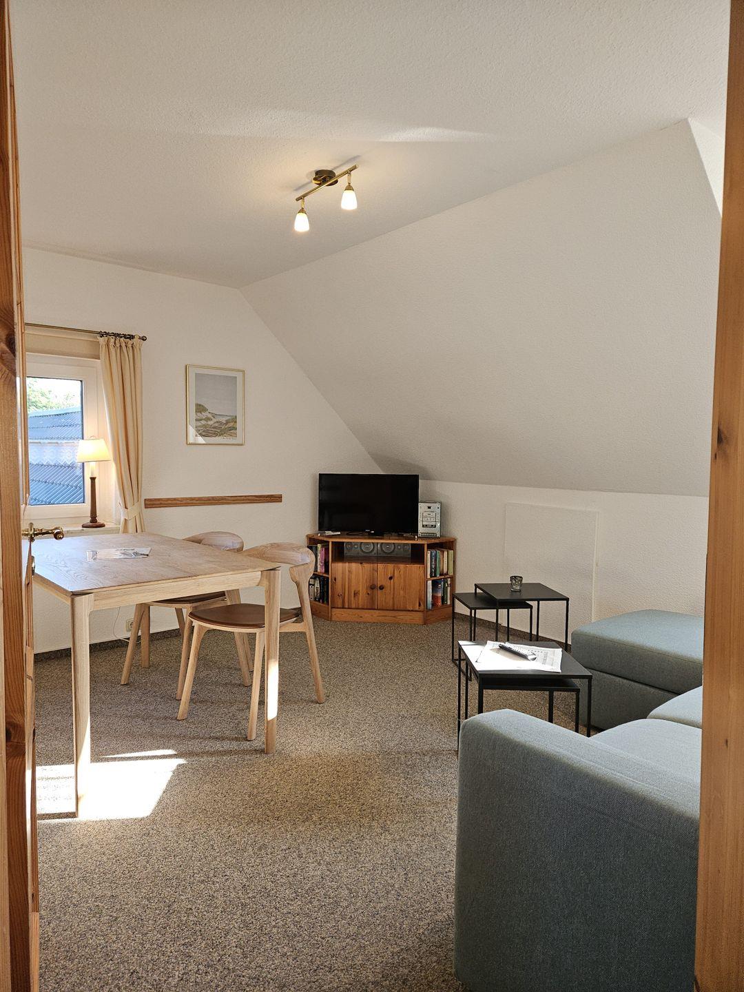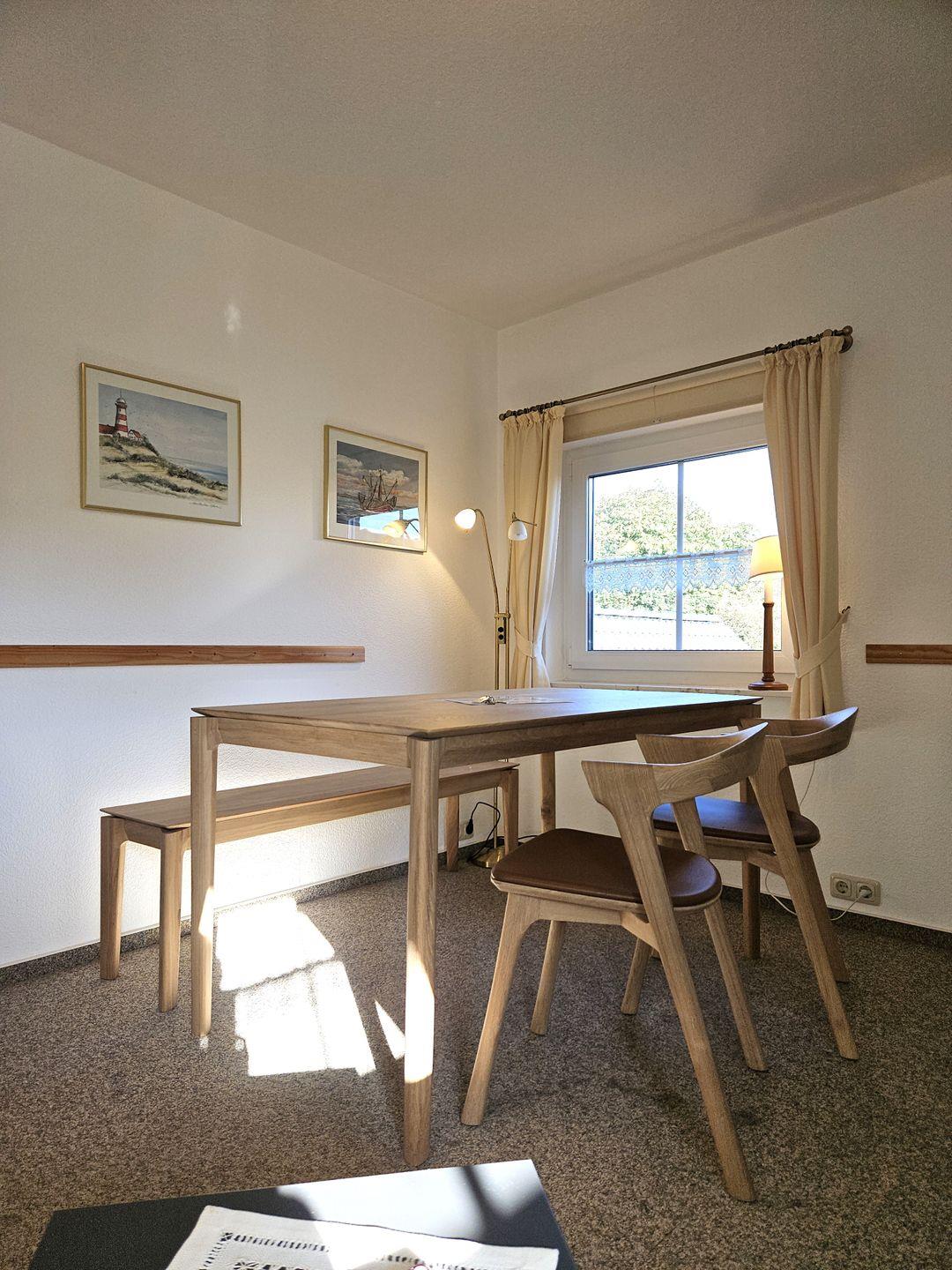 Im Wohnbereich laden ein gemütlicher Sessel und ein Esstisch zu gemeinsamen Stunden ein. Dank großflächiger Fenster genießen Sie helle Räume und ein freundliches Ambiente. Im gesamten Ferienhaus steht Ihnen kostenfreies WLAN zur Verfügung.