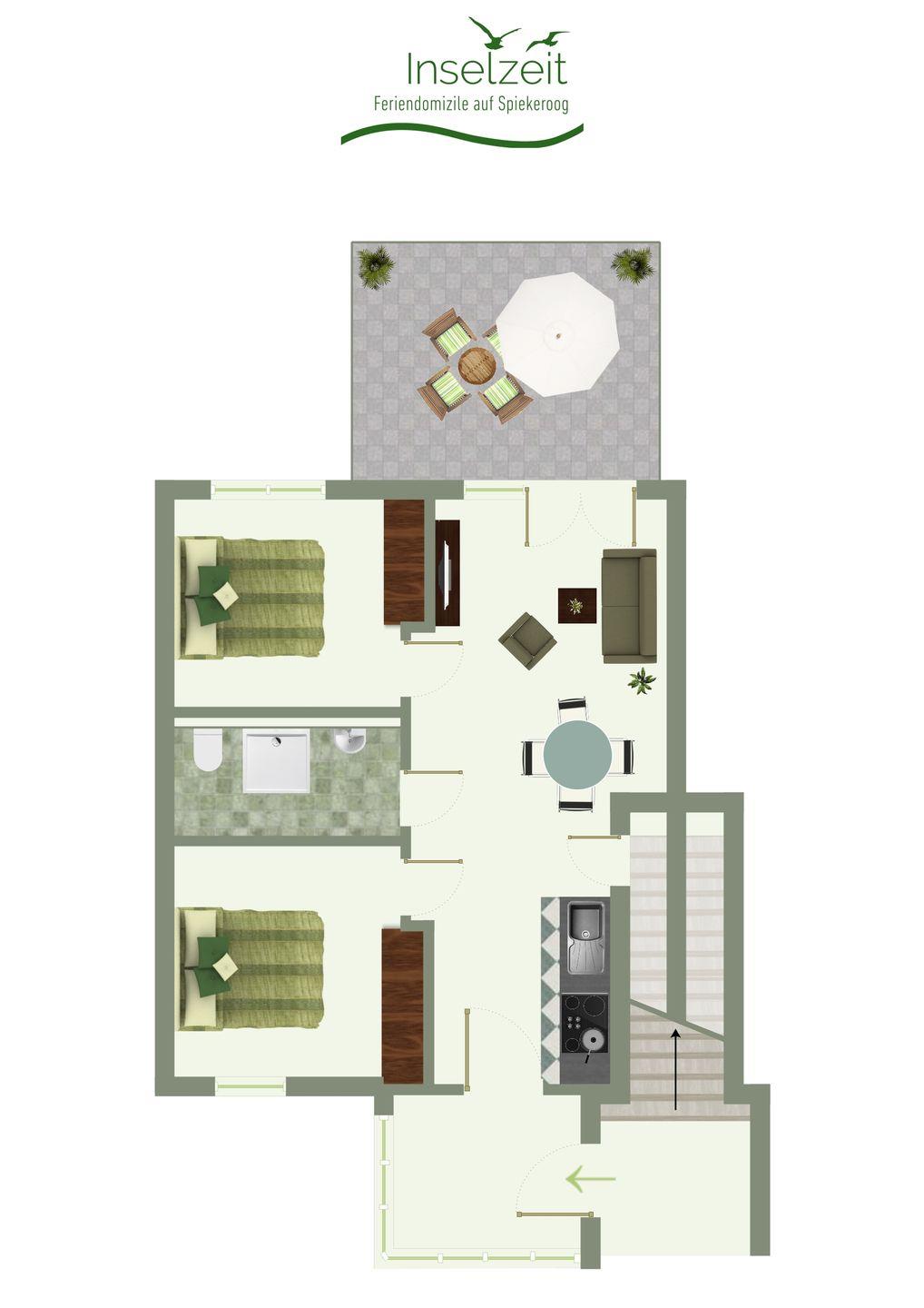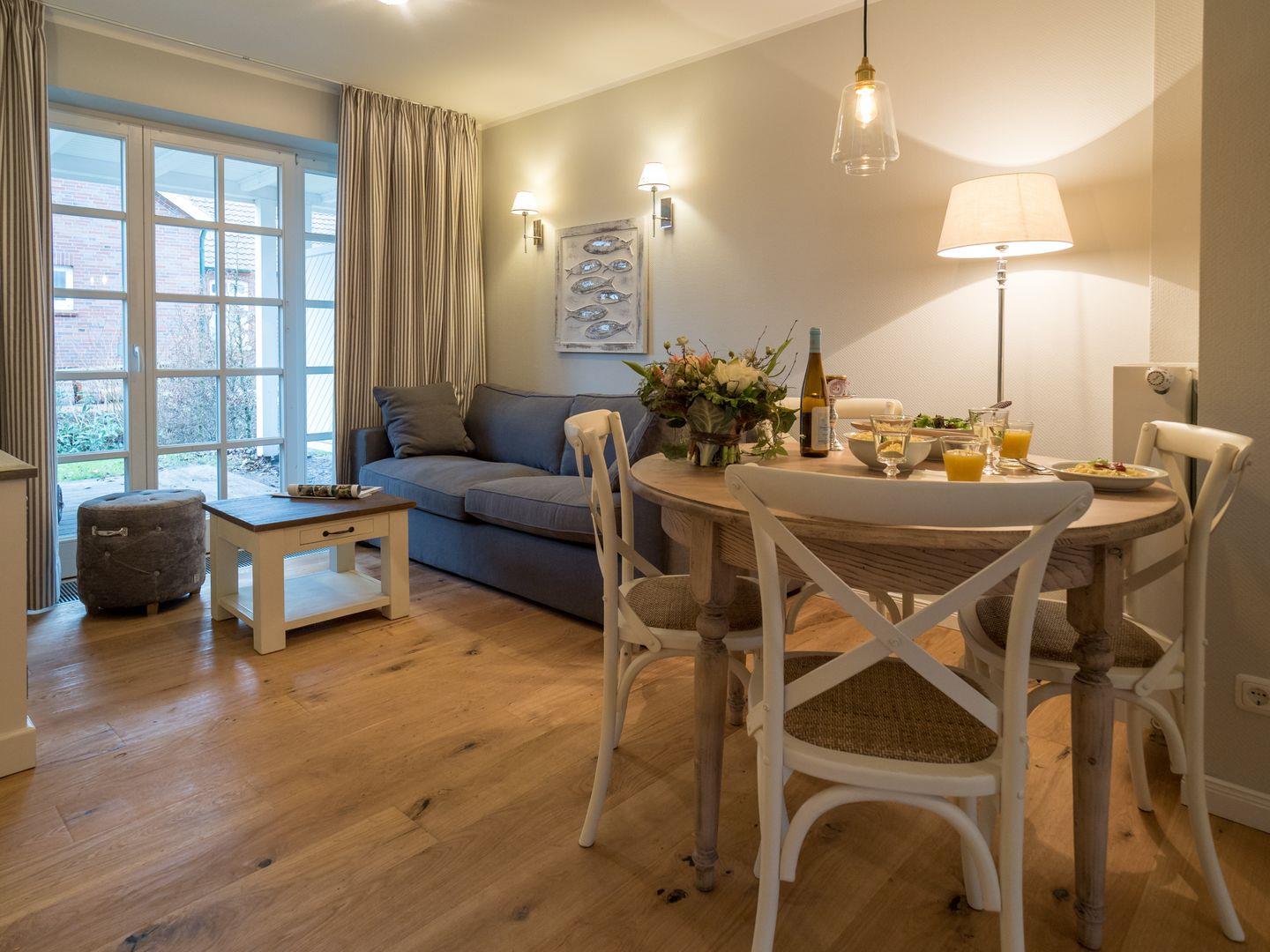 Gemütliche Ferienwohnung mit moderner Küche und Terrasse in ruhiger Lage nahe Spiekeroogs Dünenlandschaft.