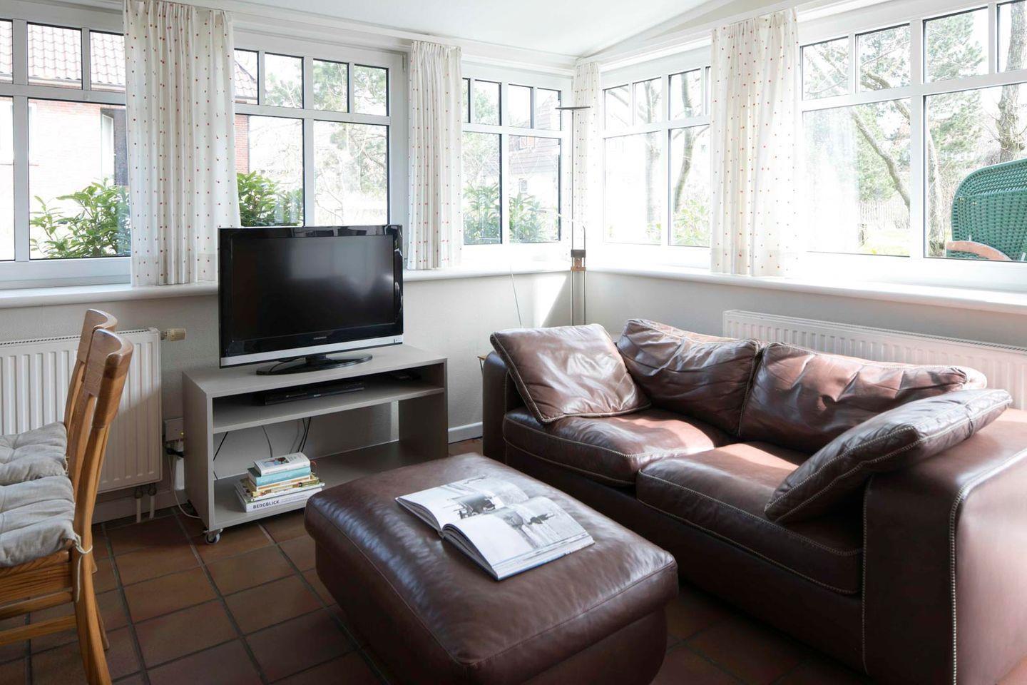 In der typischen Spiekerooger Veranda finden Sie das helle Wohn- und Esszimmer mit einer komplett neuen Küchenzeile, einschließlich Geschirrspüler. Der Steinfußboden in diesem Bereich wird durch die Fußbodenheizung auch im Winter angenehm warm.