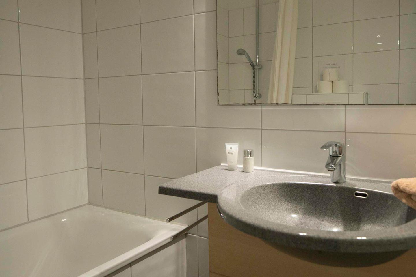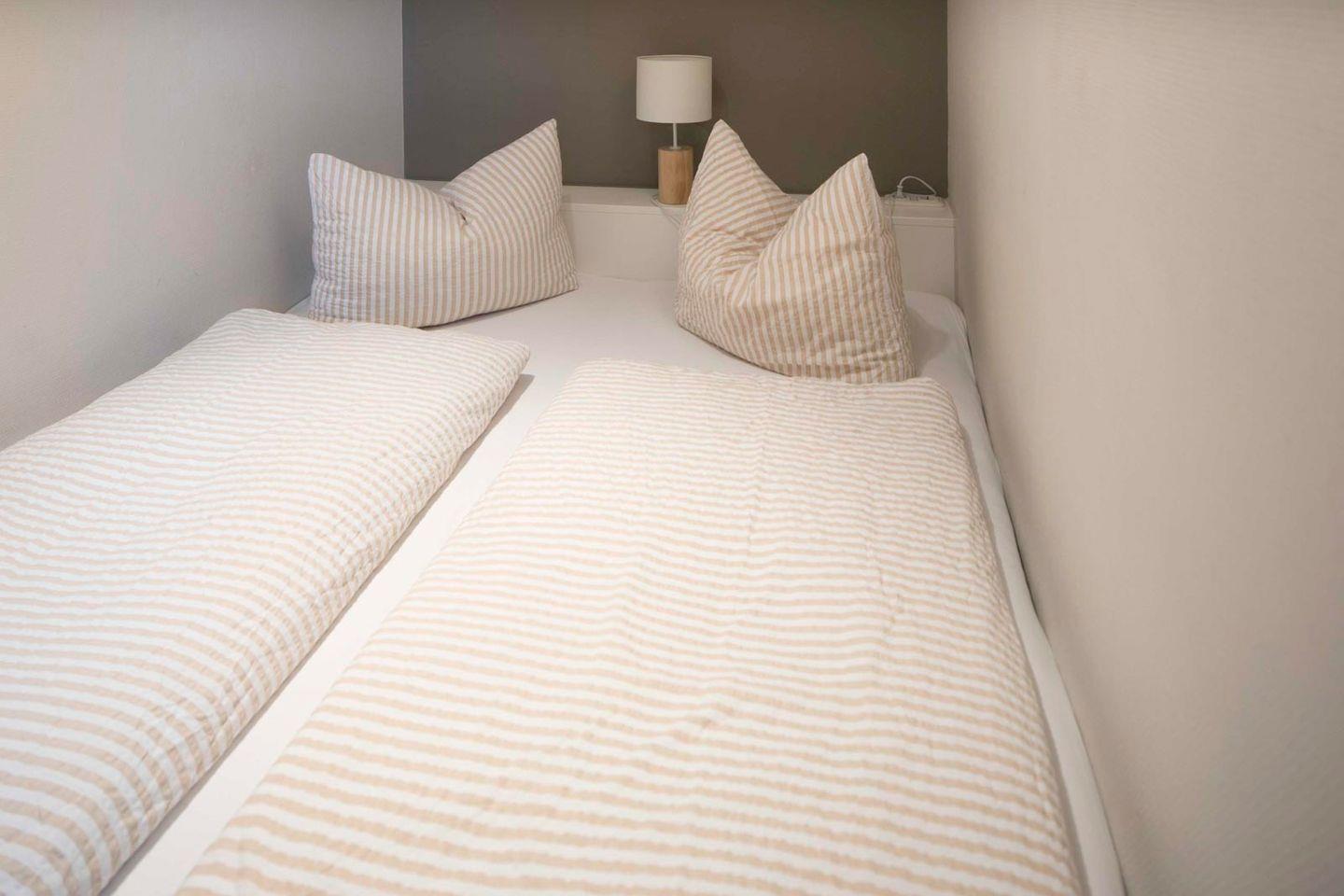 Auf etwa 50 m² finden Sie zwei separate Schlafzimmer (eins mit Doppelbett, eins mit Etagenbett), ein Badezimmer mit Wanne und Dusche, sowie einen Wohn- und Essbereich mit neuer Küchenzeile und Geschirrspüler. Der Steinfußboden ist durch Fußbodenheizung auch im Winter angenehm warm. Die Wohnung hat frische Farben, neuen Trettford-Teppich und eine sonnige Terrasse mit Sitzecke und Strandkorb für entspannte Stunden im Freien.