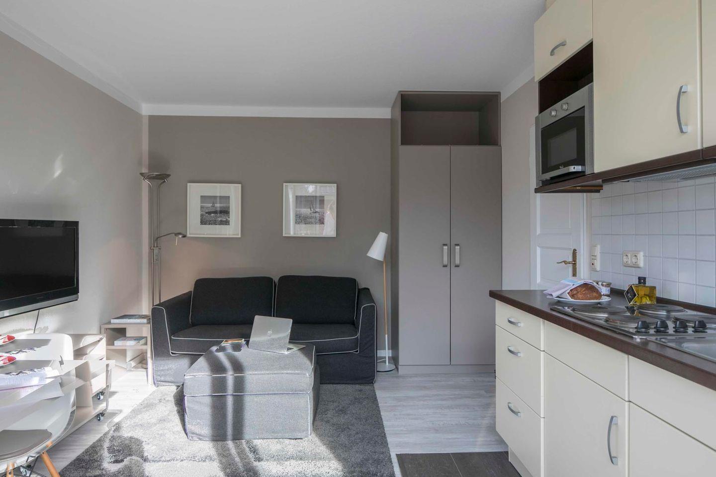 Diese helle, charmante Wohnung wurde umfassend renoviert und kürzlich mit frischen Farben und neuen Möbeln ausgestattet. Auf 30 m² finden Sie ein kleines Alkoven-Schlafzimmer mit einem Bett (1,60 x 2,00 m), ein Wohn- und Esszimmer mit Küchenzeile sowie einen großen Westbalkon. Das Badezimmer bietet eine Wanne, die auch als Dusche genutzt werden kann. Ein zusätzliches Fenster sorgt für viel Licht. Die freundliche Einrichtung schafft eine einladende Atmosphäre für Ihren Aufenthalt.