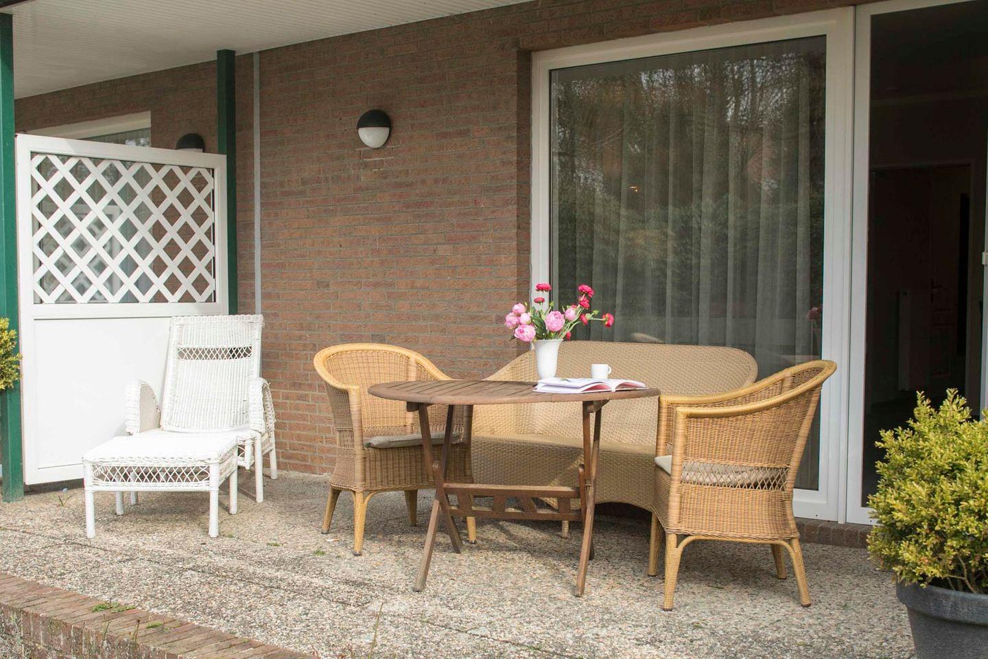 Die frisch renovierte Ferienwohnung im Gästehaus Orion auf Spiekeroog bietet Komfort und eine geschützte Südterrasse mit Gartenblick.