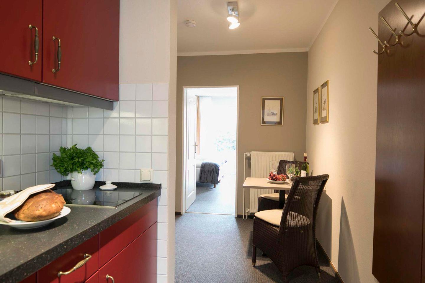 Auf etwa 35 m² bietet die Wohnung einen großzügigen Wohn- und Schlafbereich. Die hochwertige Sofaliege kann abends ohne Umbauen in ein bequemes Bett verwandelt werden. Ein Flur führt zur neuen Küchenzeile und zum Badezimmer mit flacher Dusche. Zusätzlich gibt es eine Südterrasse mit schönem Gartenblick.