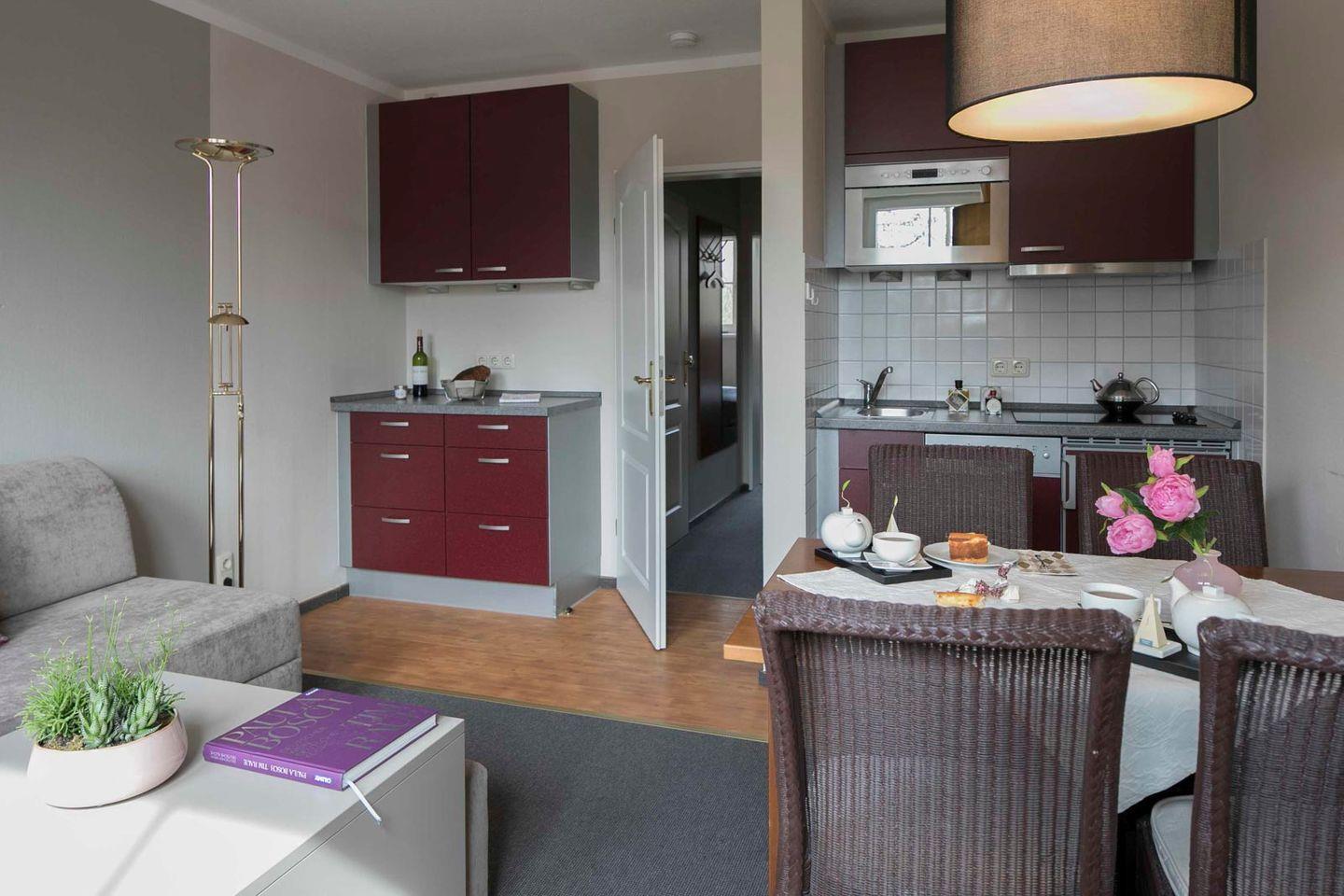 Auf etwa 42 m² bietet die Wohnung einen separaten Schlafraum mit bequemen Boxspringbett und einen Wohn- und Essraum mit hochwertiger Sofaliege, die abends ohne Umbauen in ein komfortables Bett umgewandelt werden kann. Dazu gibt es eine neue Küchenzeile, einen kleinen Flur mit Garderobe und ein Badezimmer mit sehr flacher Dusche. Der Südbalkon bietet einen schönen Gartenblick.
