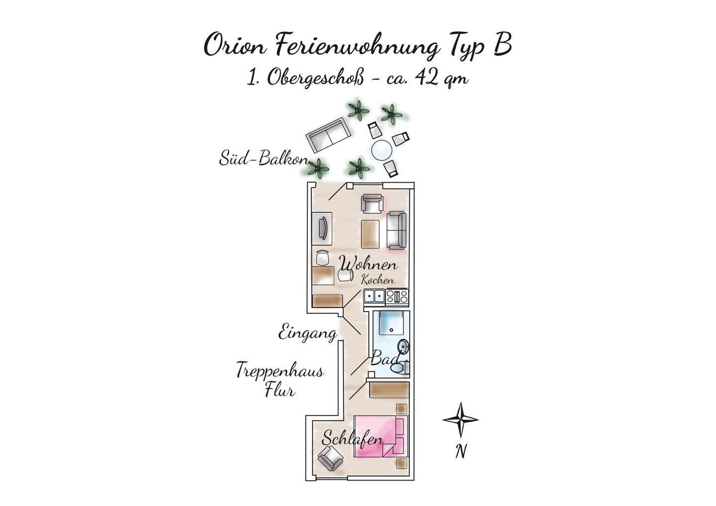 Auf etwa 42 m² bietet die Wohnung einen separaten Schlafraum mit bequemen Boxspring-Betten sowie einen Wohn- und Essbereich mit einer hochwertigen Sofaliege, die eine komfortable Schlafmöglichkeit ohne Umbau bietet. Die neue Küchenzeile ist vollständig ausgestattet. Ein kleiner Flur mit Garderobe, ein Badezimmer mit Dusche und ein Südbalkon mit schönem Blick in den Garten ergänzen das Angebot.