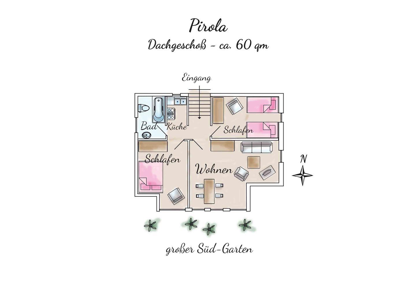 Die Dachgeschosswohnung im Ferienhaus Pirola wurde umfassend renoviert und mit frischen Farben und neuen Möbeln aufgefrischt. Auf 60 m² erwarten Sie zwei Schlafzimmer (Doppelbett und Einzelbetten) sowie ein lichtdurchfluteter Wohnbereich mit Blick über den Kurpark. Das Badezimmer bietet eine Wanne mit Dusche. Die kleine Küchenzeile ist mit Mikrowelle und Spülmaschine ausgestattet. Zur Wohnung gehört ein Sonnendeck im Garten mit Sitzgruppe, Strandkorb und einem überdachten Sandkasten.