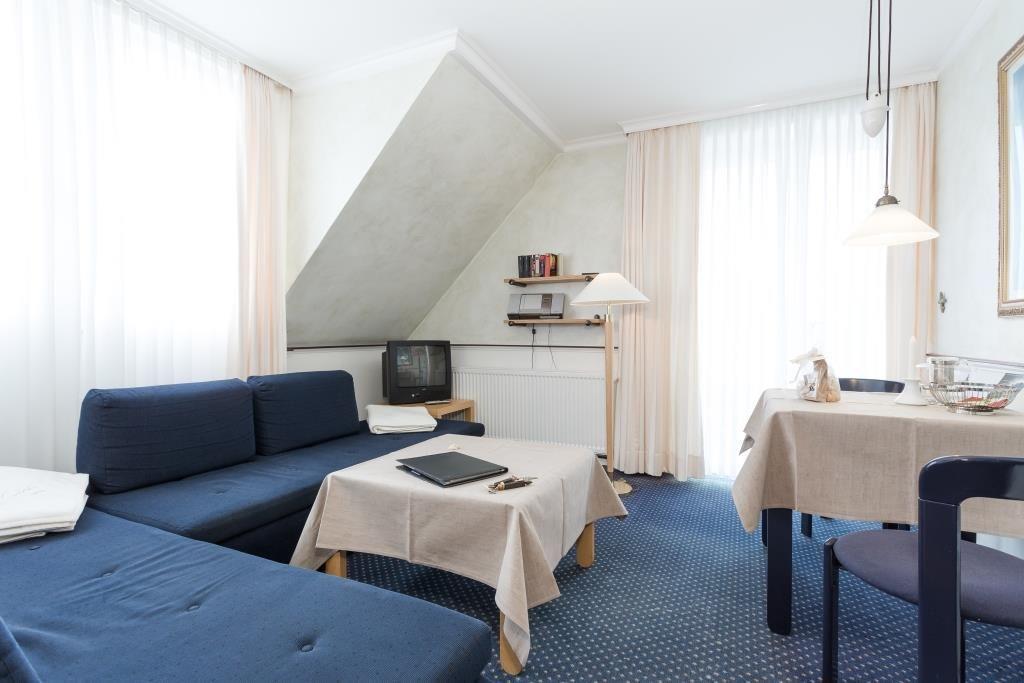 Ferienwohnung (ca. 34 m²) mit Balkon, Schlafmöglichkeiten für bis zu 2 Personen, 1 Badezimmer mit Dusche und Badewanne, Küchenzeile. Waschmaschine, Trockner, sowie Solarium und Sauna gegen Münzen im Haus verfügbar
