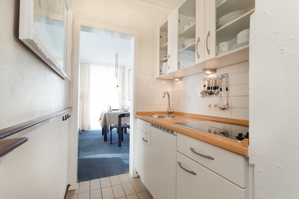 Die voll ausgestattete Küche ist sowohl funktional als auch praktisch gestaltet. Hier finden Sie ein Cerankochfeld, einen Kühlschrank mit Gefrierfach, eine Mikrowelle, Toaster und Kaffeemaschine. Geschirr, Besteck, Kochutensilien sowie Gewürze sind ebenfalls vorhanden. Die Wohnung verfügt über einen Balkon.