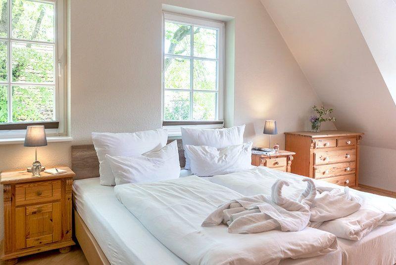 Unsere hell und freundlich eingerichtete Ferienwohnung 5 mit Balkon für 2 Personen (plus Kleinkind möglich) hat eine Wohnfläche von 56 m². Sie verfügt über ein großes, gemütliches Schlafzimmer, ein großes Wohnzimmer mit Essbereich und Küche und einem großen Bad mit Dusche und Badewanne. Auf Wunsch stellen wir Ihnen einen Kinderhochstuhl sowie ein Kinderreisebett zur Verfügung.