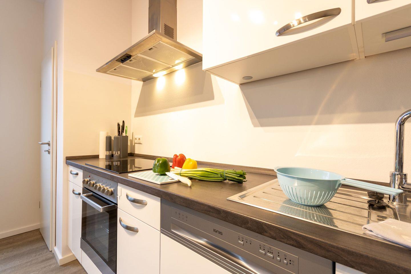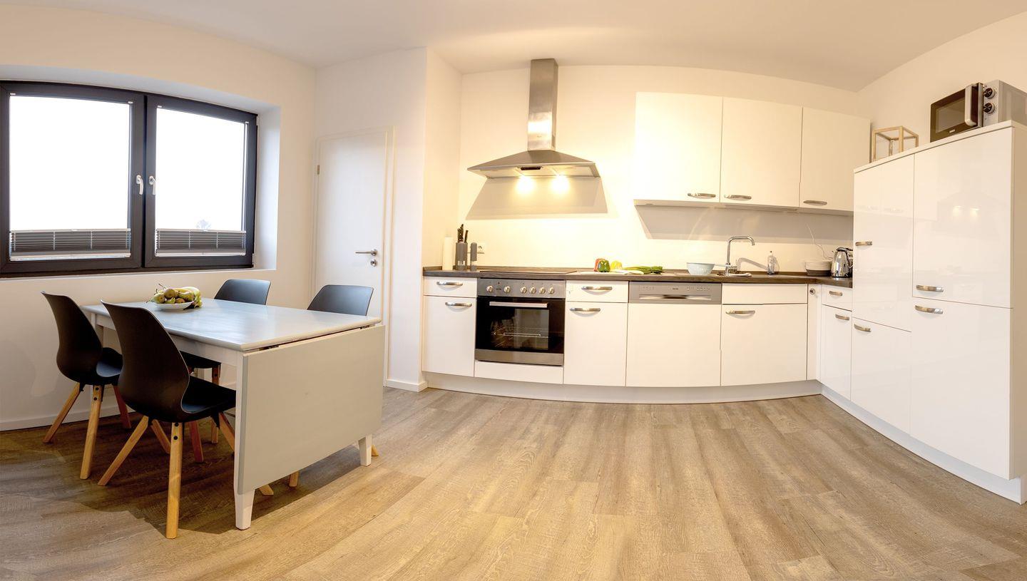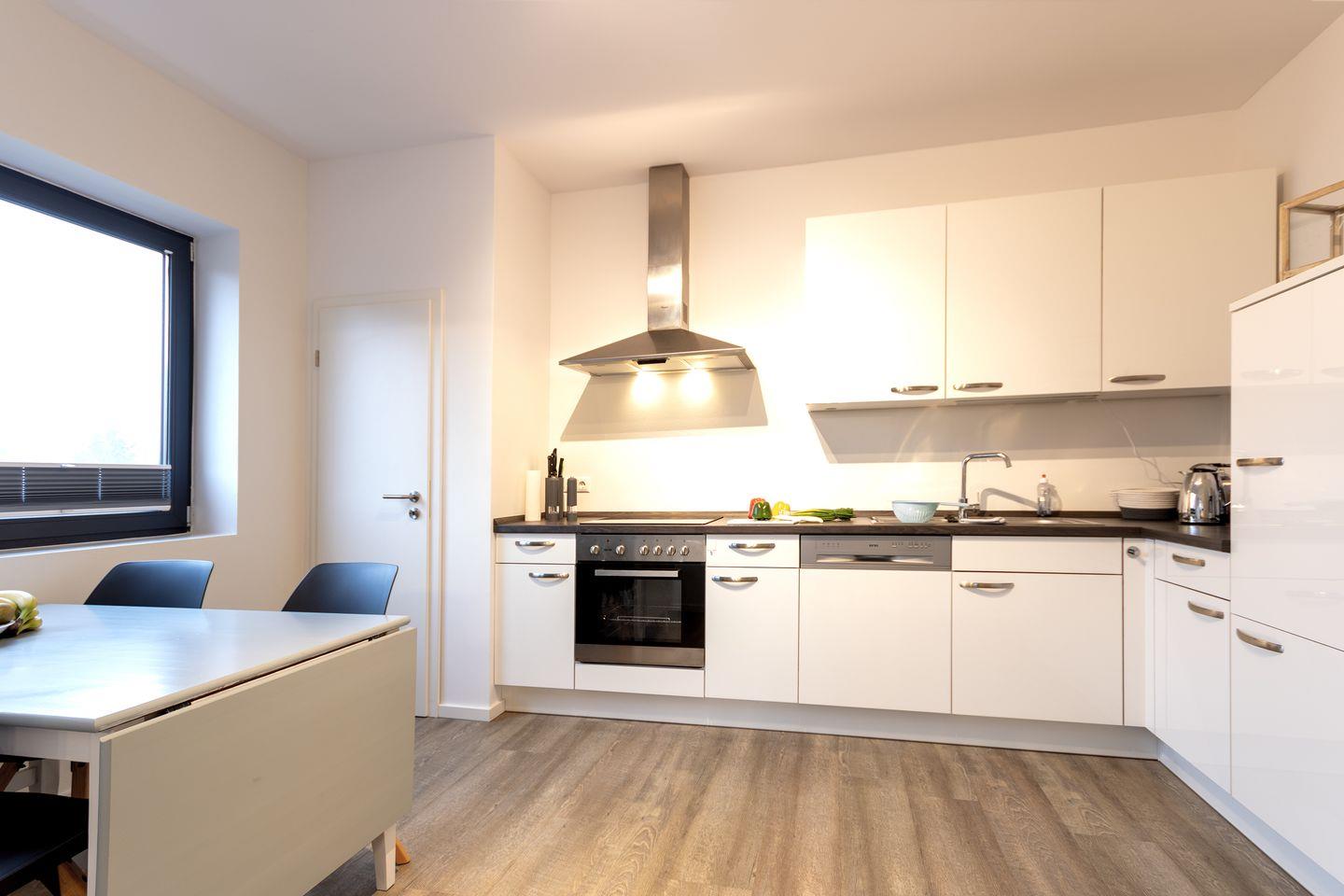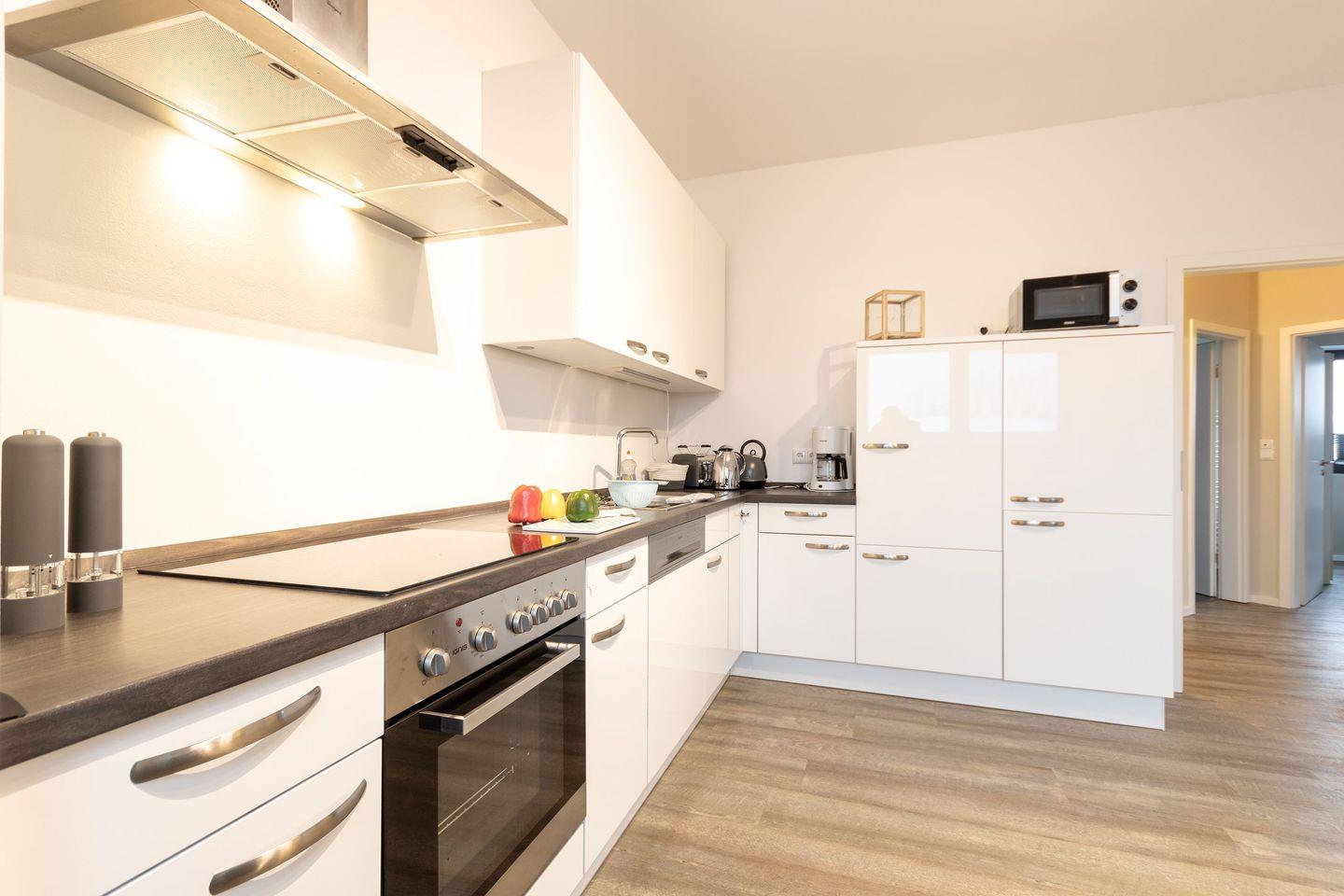 Die zum Wohnbereich einsehbare Küche ist mit einem Esstisch, 4er-Cerankochfeld, Backofen, Geschirrspülmaschine, Wasserkocher, Kaffeemaschine, Toaster, Gefrierschrank und Kühlschrank ausgestattet. Selbstverständlich sind ausreichend Geschirr sowie die üblichen Utensilien einer Küche vorhanden.