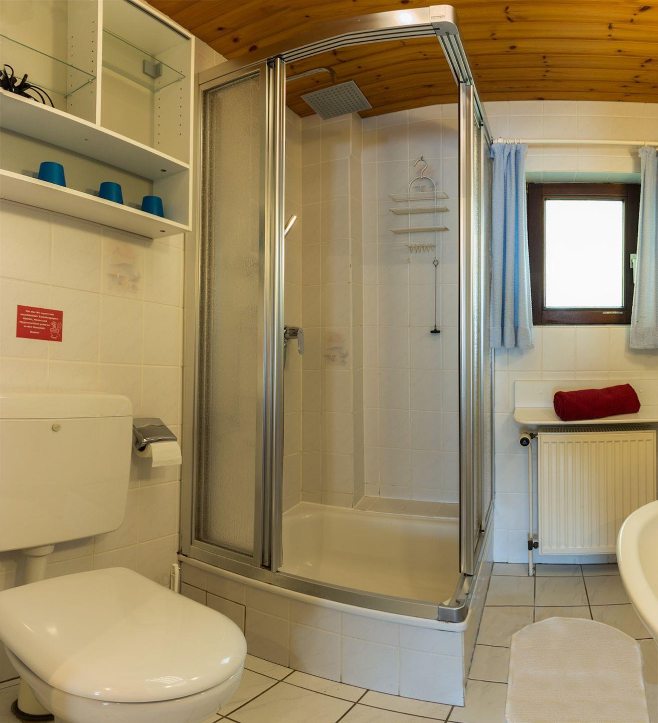 Das Tageslicht Duschbad verfügt über ausreichend Ablageflächen und ein Fenster mit Insektenschutzgitter zum Lüften.