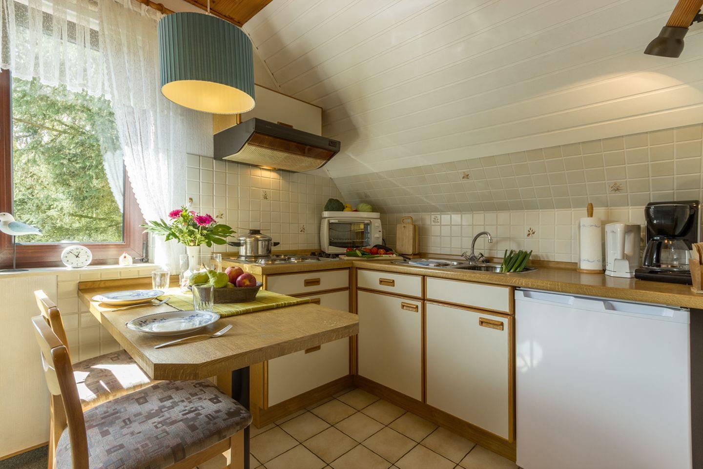 Die im Wohnzimmer integrierte Küchenzeile ist mit einem Esstisch, 4-Platten-Kochfeld, Wasserkocher, Kaffeemaschine, Toaster, Eierkocher, kleinem Umluftbackofen und Kühlschrank mit Eisfach ausgestattet. Selbstverständlich sind ausreichend Geschirr sowie die üblichen Utensilien einer Küche vorhanden.