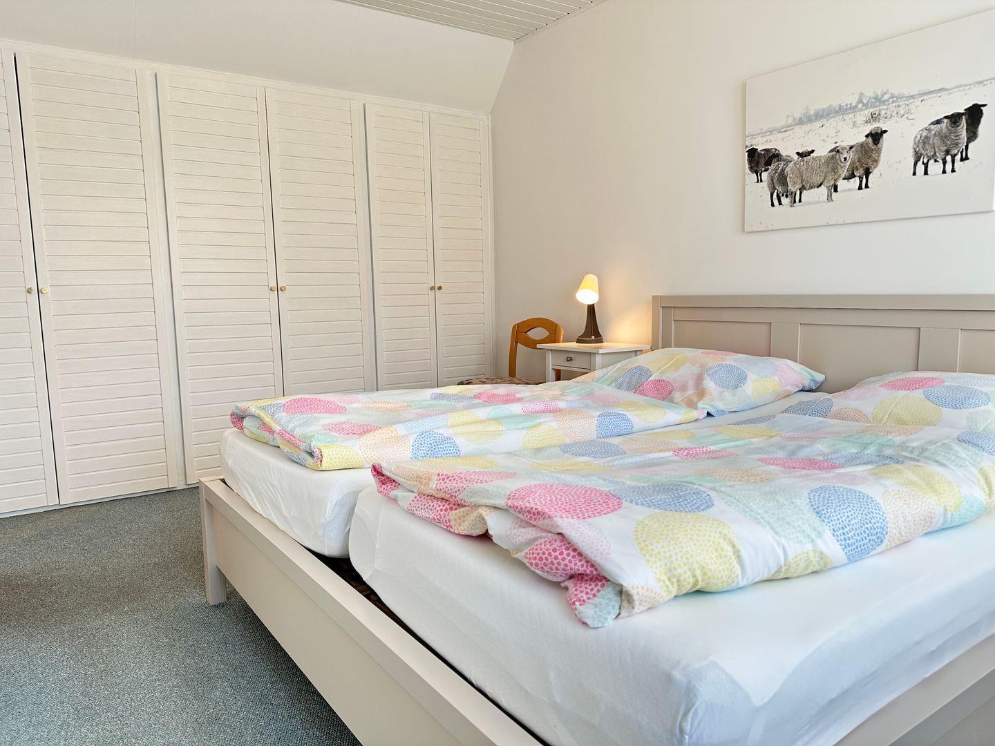 Das Doppelbett-Schlafzimmer mit großen Einbauschränken bietet sehr viel Stauraum.