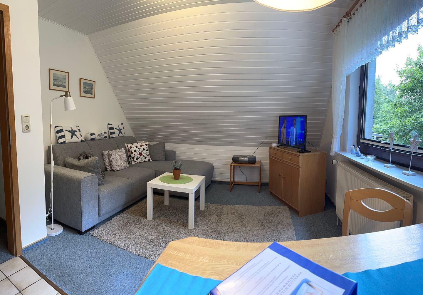 Das Wohnzimmer verfügt über eine gemütliche Eckcouch. Ein Farb-Sat-TV sowie eine Mini-Musikanlage sind selbstverständlich vorhanden. Ein WLAN-Zugang steht Ihnen kostenlos zur Verfügung.