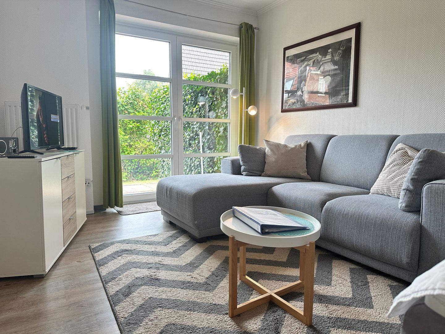 Im gemütlichen und hellen Wohnzimmer finden Sie ein bequemes Sofa, einen Flachbildfernseher mit Farb-Sat-TV, DVD-Player und Mini-Stereoanlage mit CD-Player. Weiterhin steht ein kostenfreier WLAN-Zugang zur Verfügung.