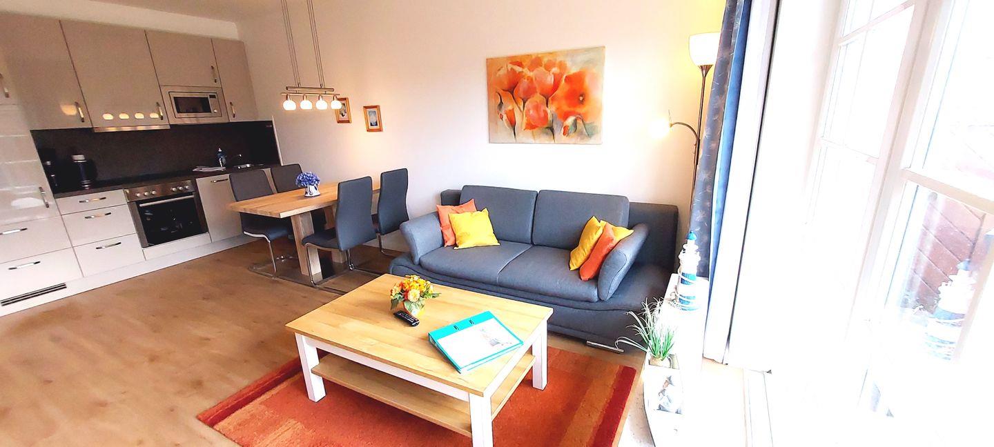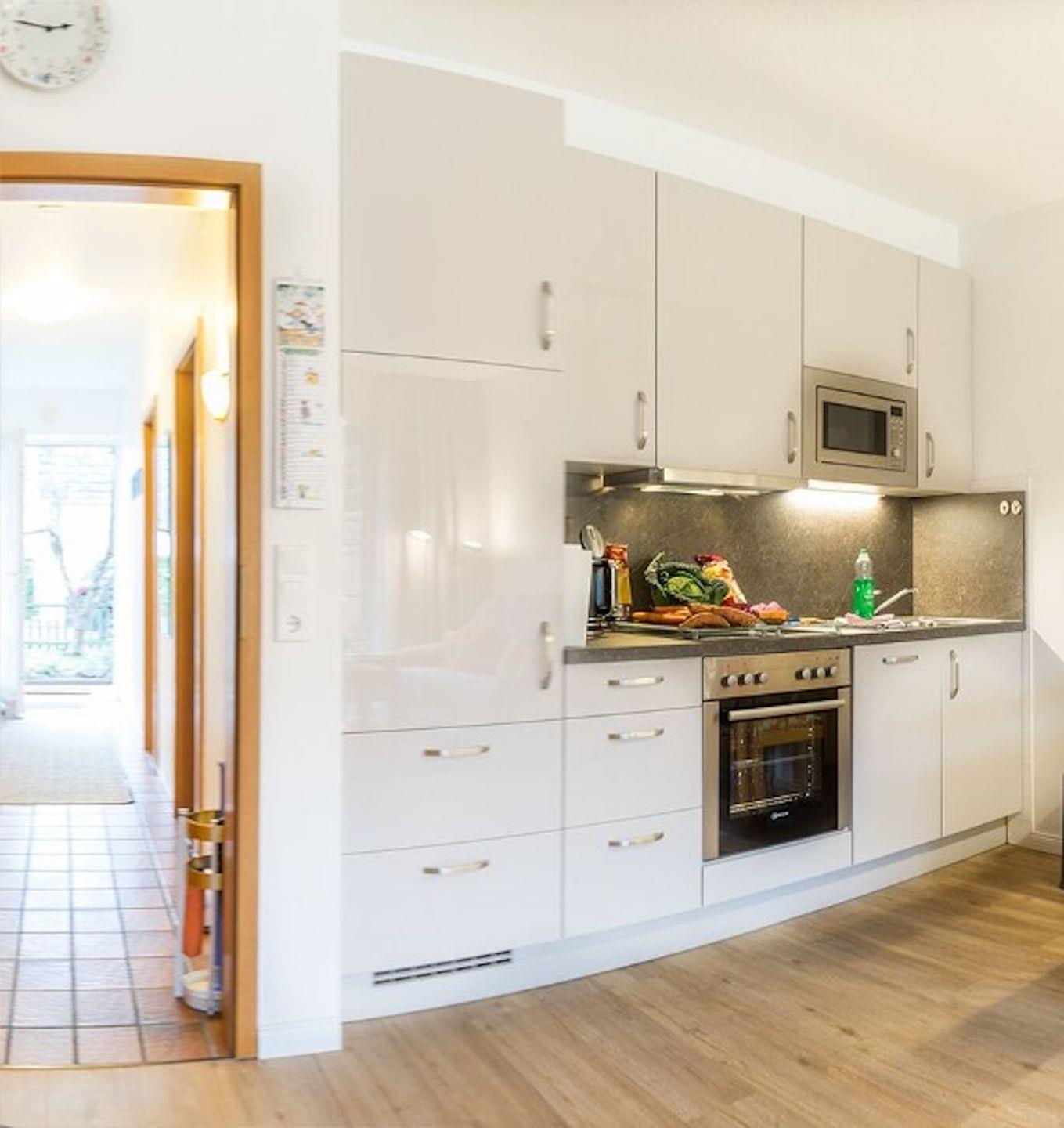 Bestandteil des Wohnraums ist die moderne Einbauküche mit Spülmaschine, Cerankochfeld, Backofen, Kühlschrank & Mikrowelle. Kaffeemaschine, Wasserkocher, Toaster und alles weitere Küchenzubehör wie Geschirr, Besteck, Töpfe und Pfannen sind neuwertig und ausreichend vorhanden.