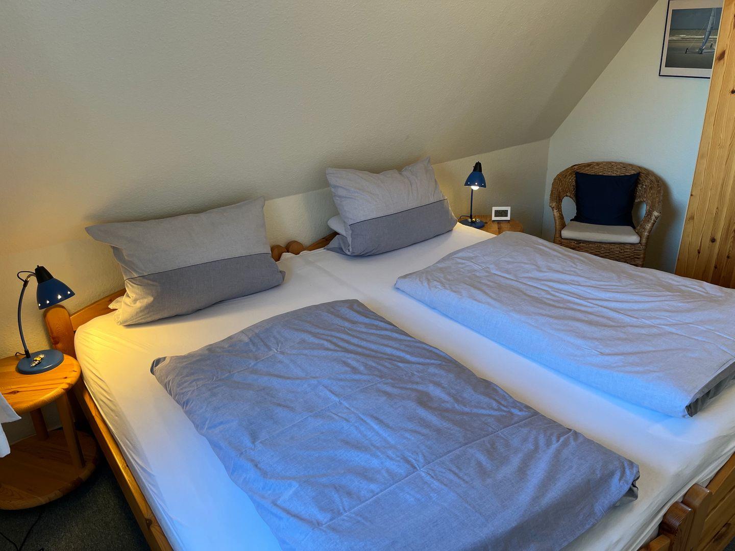 Das Schlafzimmer bietet ein Doppelbett, ein Fenster bringt Tageslicht und die beste Seeluft in den Raum.