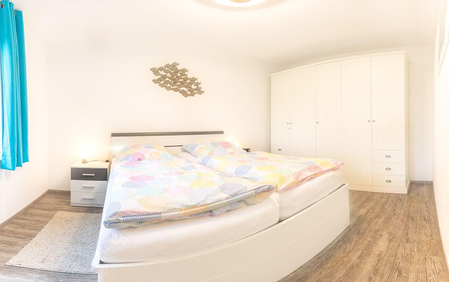 Diese Wohnung verfügt über ein Schlafzimmer. Dieses ist mit einem Doppelbett ausgestattet, zusätzlich gibt es im Wohnzimmer eine gute Schlafcouch mit Lattenrost (140x200cm). Alle Fenster lassen sich gut verdunkeln. Selbstverständlich gibt es Schränke um Ihre Urlaubsgarderobe usw. zu verstauen.