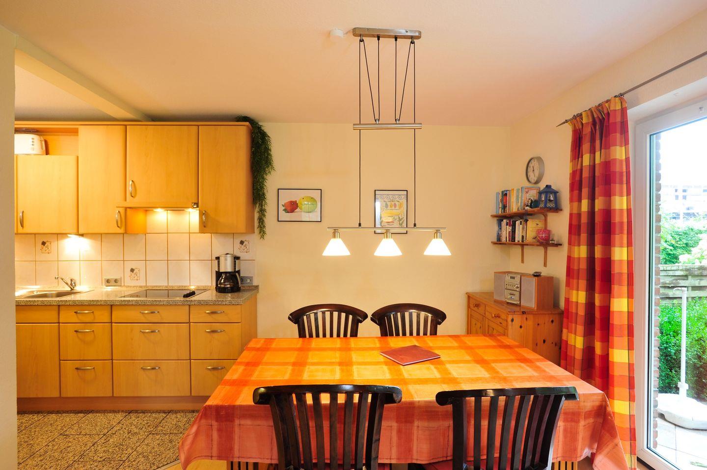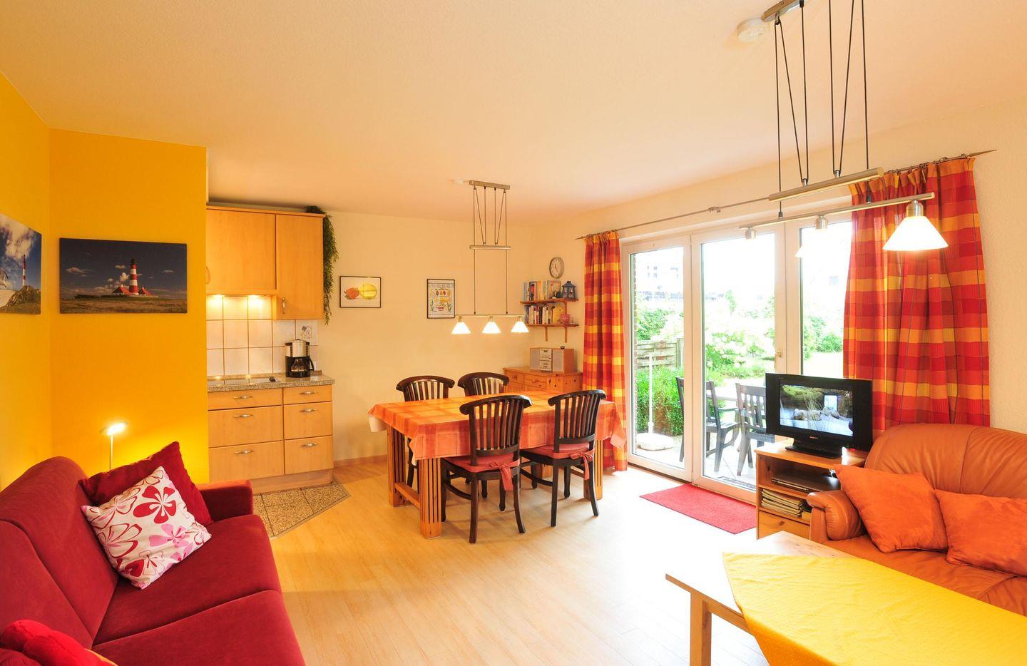 Das Wohnzimmer ist mit einem Flachbild-Farb-TV & DAB / Internet Radio, Blue-Ray Player, Mini-Stereoanlage, Internetzugang über WLAN, einer Eckcouch, sowie einem bequemen Schlafsofa (140×200 cm mit Lattenrost) ausgestattet. Weiterhin befindet sich dort ein Esstisch zwischen Küche und Wohnraum, zum leckeren Essen bzw. für ausgelassene Spieleabende.