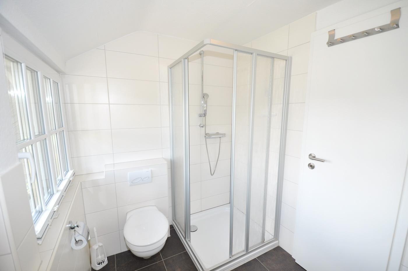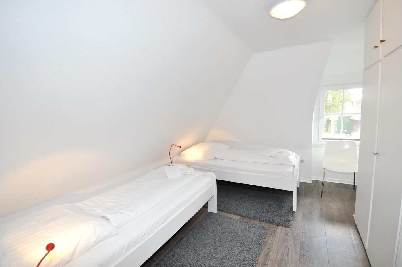 Obergeschoss: ein Schlafzimmer mit Doppelbett (180 x 200 cm) und zusätzlicher Sitzecke mit TV, ein Schlafzimmer mit Doppelbett (180 x 200 cm), ein Schlafzimmer mit 2 Einzelbetten (je 80 x 200 cm), ein Duschbad / WC mit Handtuchheizung und Tageslicht