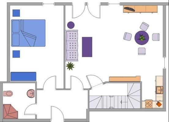 Obergeschoss: Eingangsbereich, Wohnraum mit offener Küche und französischem Balkon, Doppelschlafzimmer (180 x 200 cm), Duschbad / WC, Abstellraum