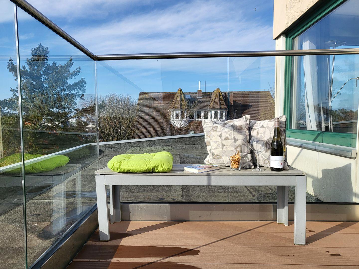 Penthouse mit Balkon und direktem Seeblick, zentral in St. Peter-Ording gelegen, mit moderner Ausstattung und Fahrstuhl.