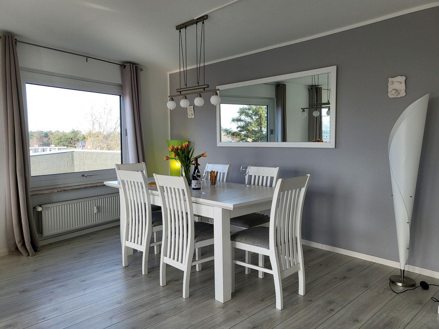 Die großzügige, ca. 70m² große, 3-Zimmer Ferienwohnung für bis zu 4 Personen liegt in der 3. Etage und begeistert mit direktem Seeblick und möbliertem Balkon. Großer Wohnraum mit komfortablem Sofa und Flachbild-TV. Kostenfreies W-LAN sorgt für die multimediale Unterhaltung im Penthouse mit Seeblick. Am Esstisch nehmen bis zu 6 Personen Platz. In den Wohnraum integriert ist die gut ausgestattete Küchenzeile mit Kühlschrank samt Gefrierfach, Kaffeemaschine und Geschirrspüler. Weiterhin sind ein separates Schlafzimmer mit großem Doppelbett sowie ein weiteres Schlafzimmer mit 120cm breiter Schlafcouch vorhanden. Zur Ferienwohnung gehören Duschbad und WC. Ein separates WC ist vorhanden.