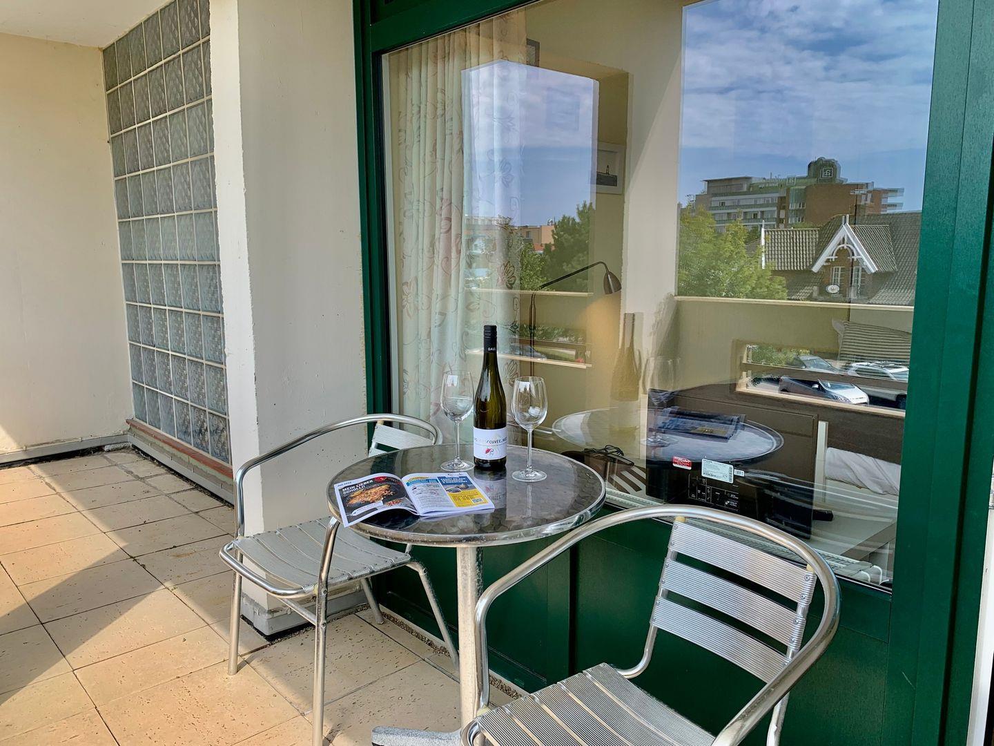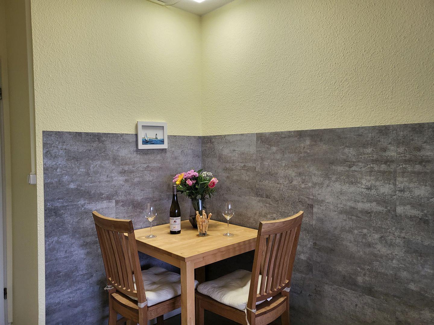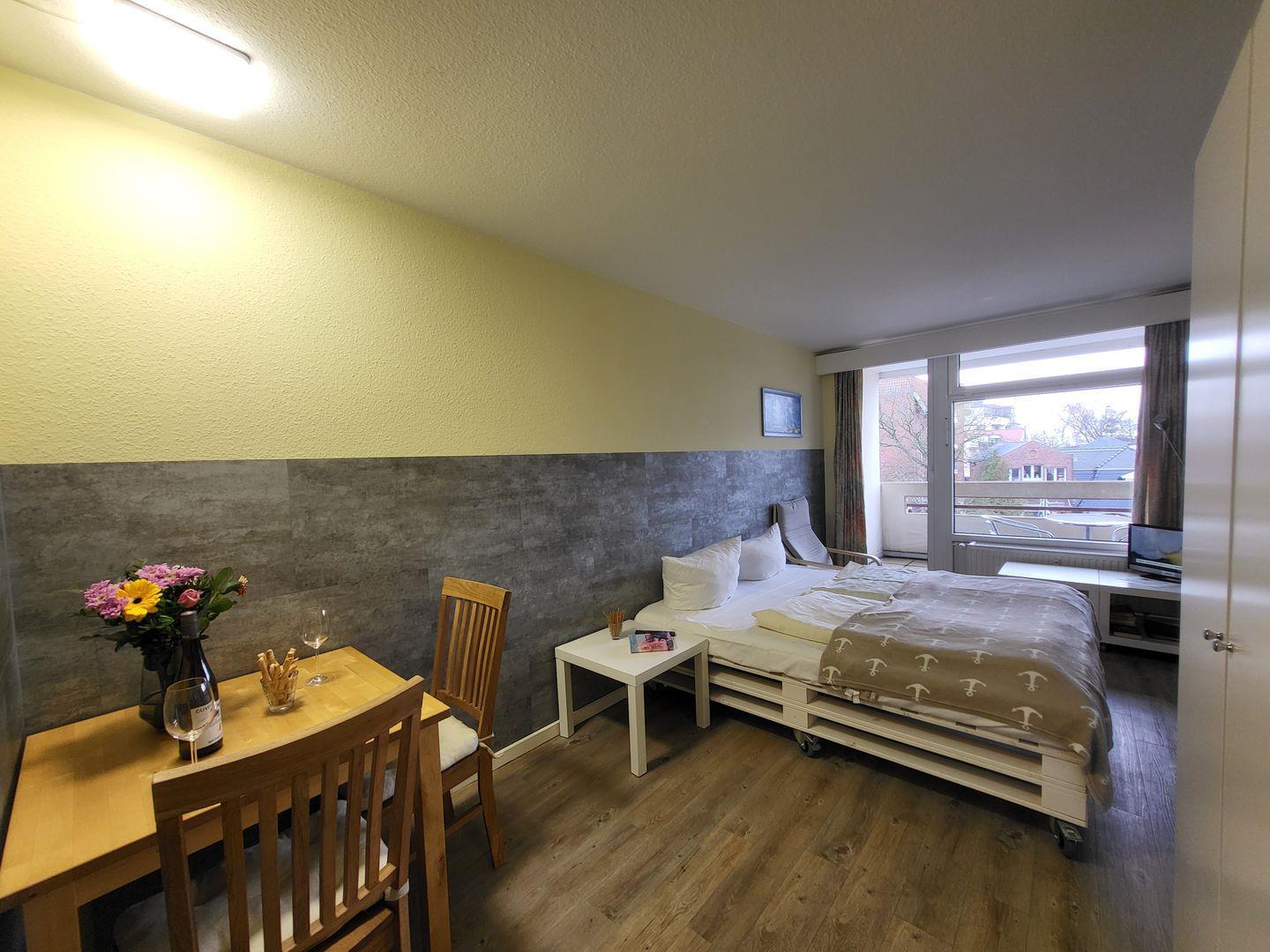 Moderne 1-Zimmer Ferienwohnung mit Balkon und Seeblick in St. Peter-Ording, ideal für 2 Personen mit kostenfreiem W-LAN und Hund auf Anfrage.