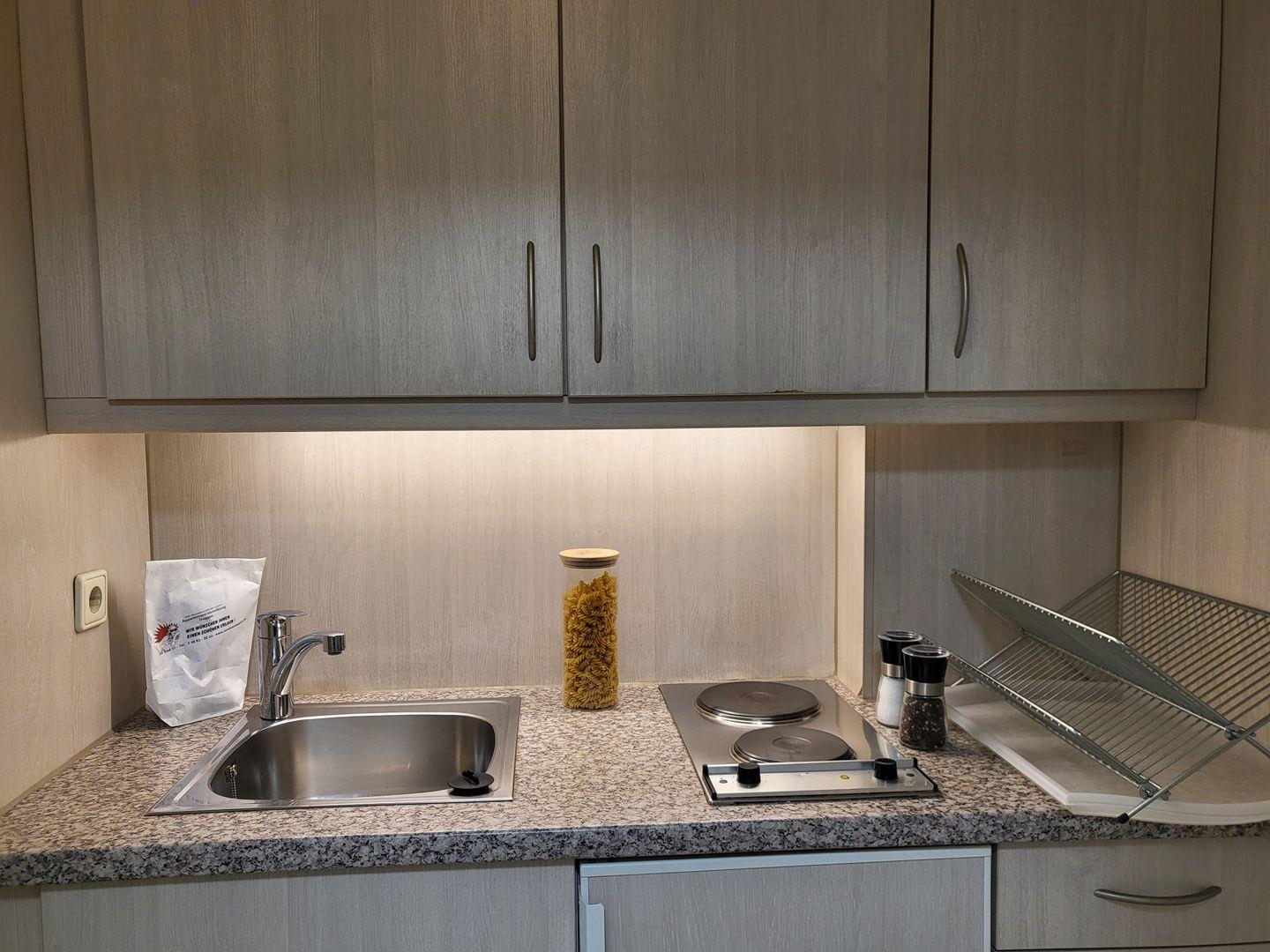 Der praktische, kombinierte Wohn-Schlafraum ist ausgestattet mit einem 160x200cm Palettenbett mit zwei Einzelmatratzen, einer kompakten Essecke und einem gemütlichen Sessel sowie Flachbild-TV. Auch kostenfreies W-LAN ist hier vorhanden. Durch den angrenzenden, möblierten Balkon mit Blick Richtung See und die Fensterfront wirkt der Raum wunderbar hell. Die Pantry-Küche verfügt über ein 2er Kochfeld, Mikrowelle, Kühlschrank mit Gefrierfach und Kaffeemaschine. Diese Wohnung kann den Fahrstuhl nutzen.