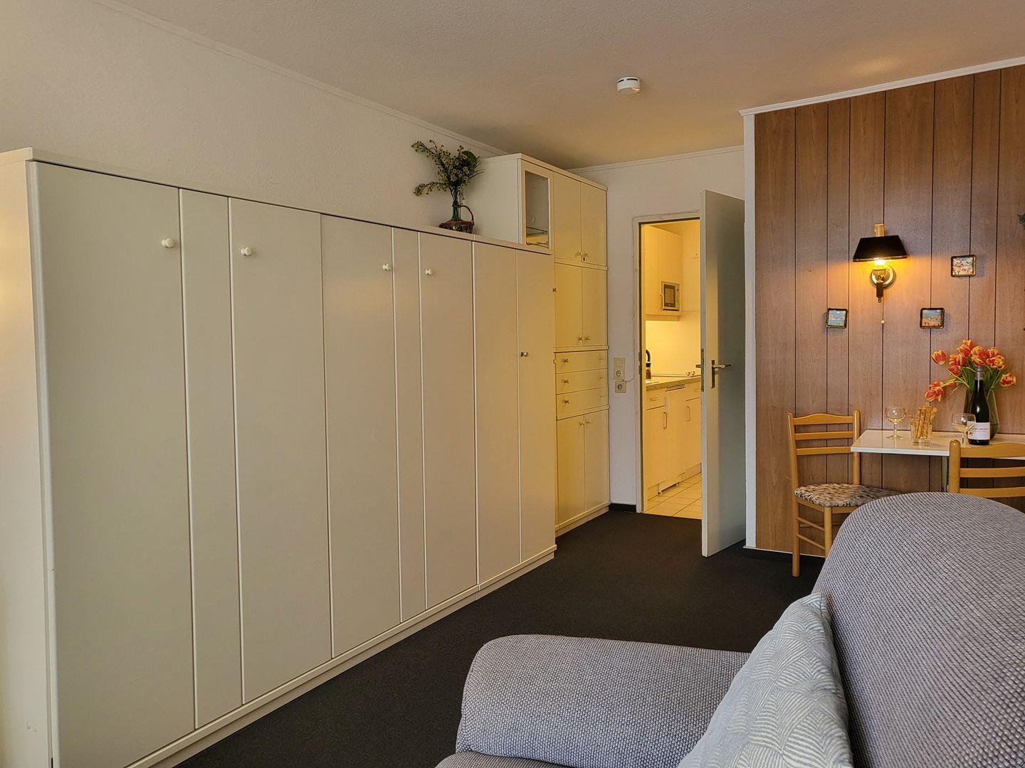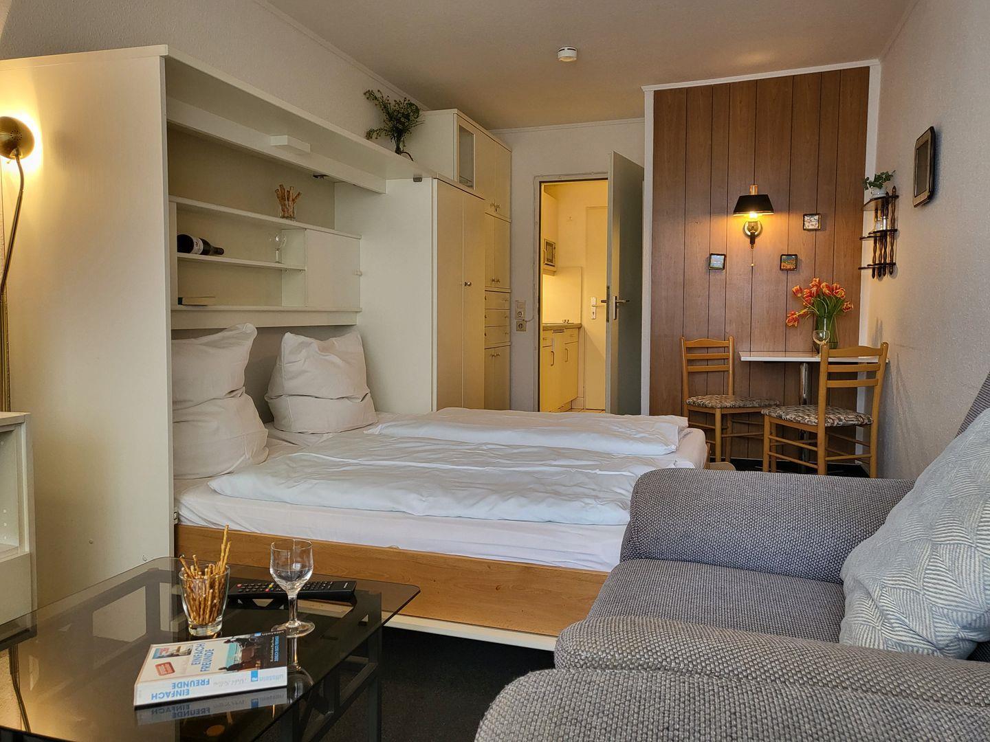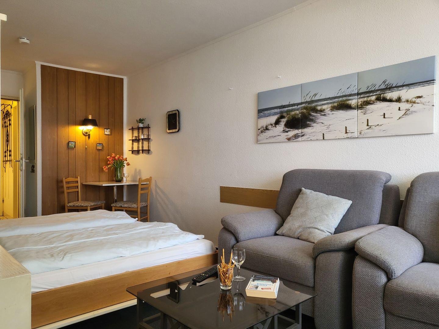 Die 25m² große 1-Zimmer Ferienwohnung liegt in der 2. Etage und bietet 2 Personen Platz für einen wunderbaren Urlaub in St. Peter Ording. Der wunderbar helle, modern eingerichtete Wohn- und Schlafraum verfügt ein komfortables, 160x200cm Schrankbett und ist darüber hinaus mit Flachbild-TV, zwei gemütlichen Sesseln sowie einer kompakten Ess-Ecke ausgestattet. Kostenfreies W-LAN steht zur Verfügung. Durch die große Fensterfront und den Übergang zum möblierten Balkon mit Blick zur Seeseite wirkt der Wohnraum wunderbar hell. Die gut ausgestattete Pantry-Küche verfügt unter anderem über ein platzsparendes, externes Cerankochfeld nebst Kühlschrank sowie Mikrowelle und Kaffeemaschine. Zur Ferienwohnung gehört ein gut ausgestattetes Duschbad mit WC. Diese Wohnung kann den Fahrstuhl nutzen.