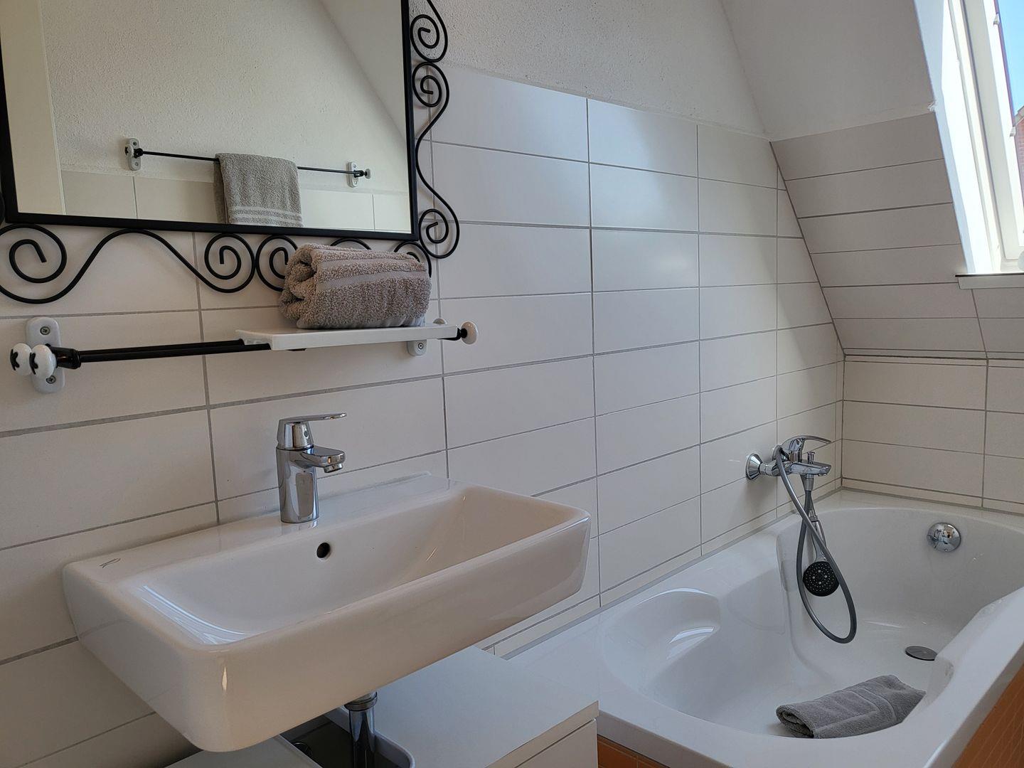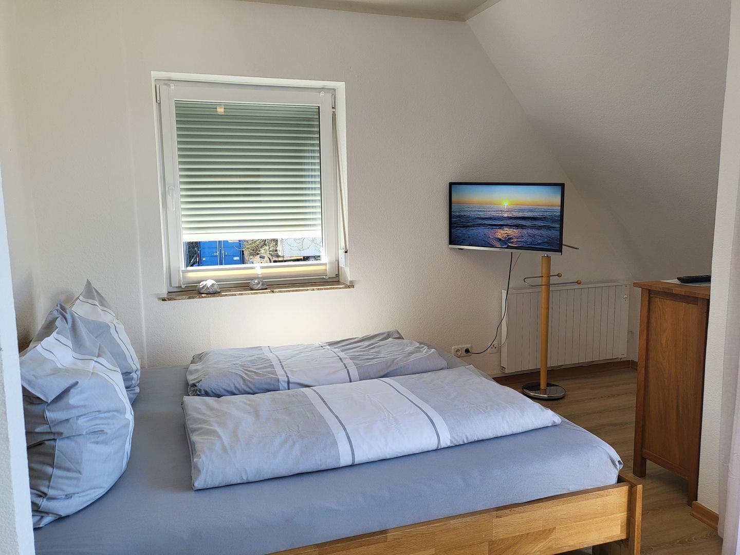 Ebenfalls im Erdgeschoss untergebracht ist ein Schlafzimmer mit komfortablem 140x200cm Doppelbett sowie ein Duschbad mit WC. Das Obergeschoss ist ausgestattet mit zwei weiteren Schlafzimmern. Eines verfügt über ein 140x200cm Doppelbett, ein weiteres ist mit einem 160x200cm Doppelbett ausgestattet. Das große Schlafzimmer verfügt über Zugang zum Balkon und ist zudem ausgestattet mit einem eigenen Flachbild-TV. Weiterhin ist ein geräumiges Badezimmer mit Badewanne und WC auf der Etage untergebracht.