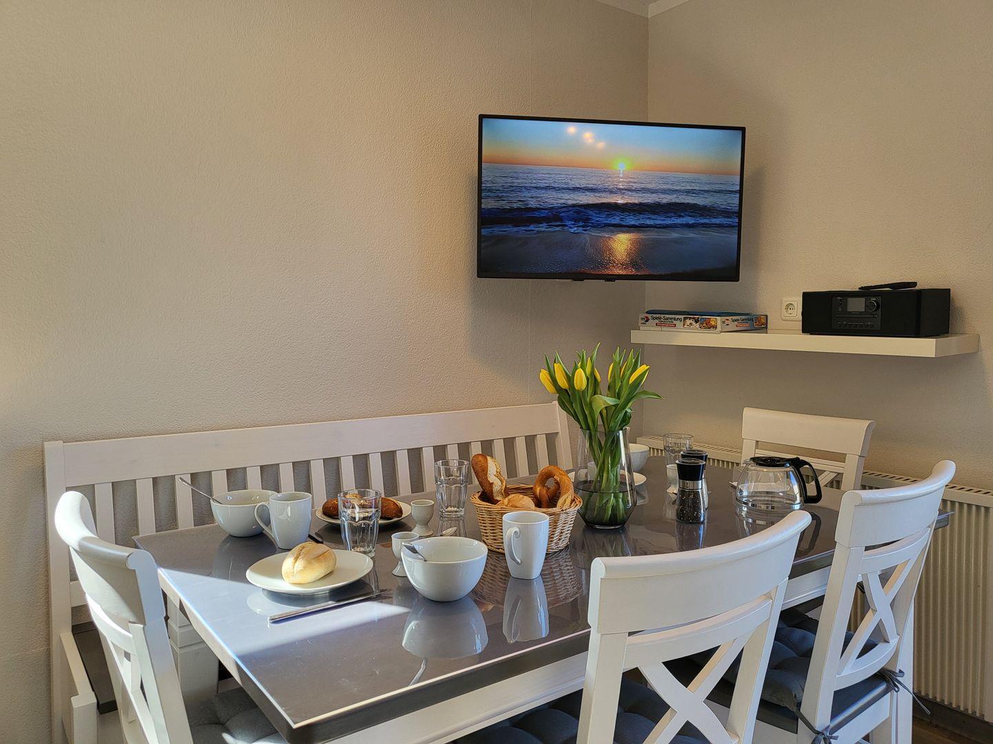 Durch den Übergang zur möblierten Terrasse wirkt das geräumige Wohnzimmer wunderbar hell und einladend. Zur Ausstattung gehört hier eine große, edle Ledercouch, die eine tolle Grundlage für entspannte Stunden bietet. Für die multimediale Unterhaltung sorgen Flachbild-TV mit DVD-Player sowie Musikanlage und kostenfreies W-LAN. In den Raum integriert liegt die gut ausgestattete Küche des Ferienhauses, hier stehen unter anderem Cerankochfeld und Backofen sowie Kühlschrank mit Gefrierfach, ein Geschirrspüler sowie Kaffeemaschine zur Verfügung. Am angrenzenden Esstisch ist Platz für die ganze Familie. Eine Senseo-Kaffeepad-Maschine ist ebenfalls vorhanden.