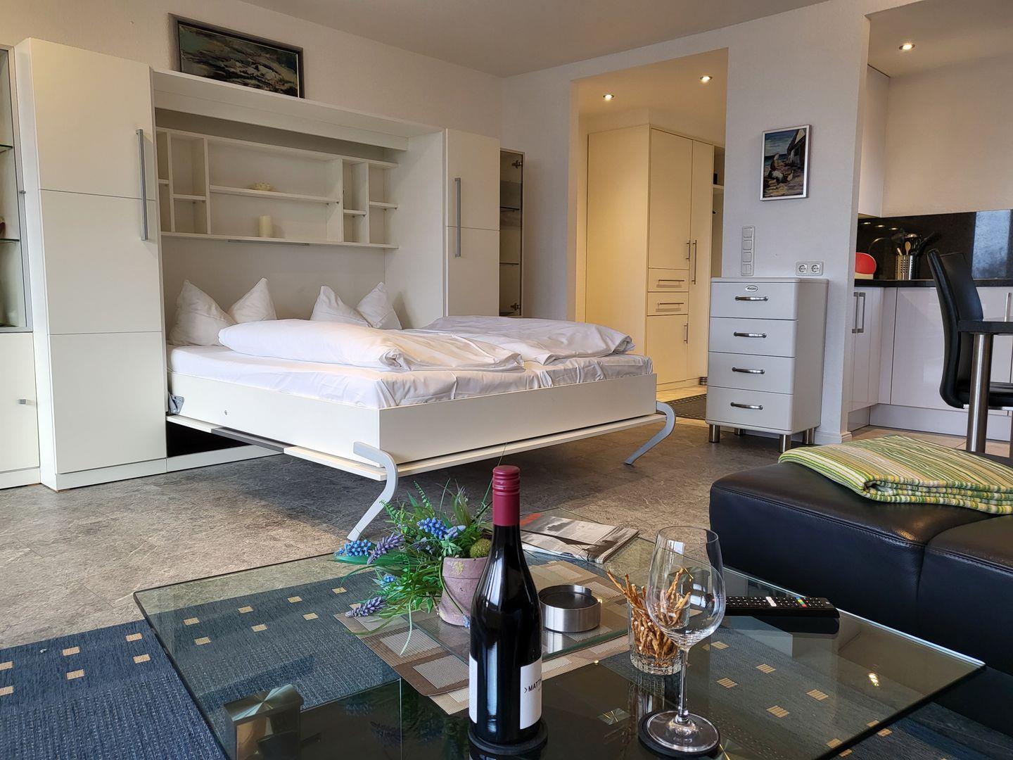 Zentrale, allergikerfreundliche 1 Zimmer Ferienwohnung im 2. OG für bis zu 2 Personen. Möblierter Balkon mit teilweisem Seeblick.