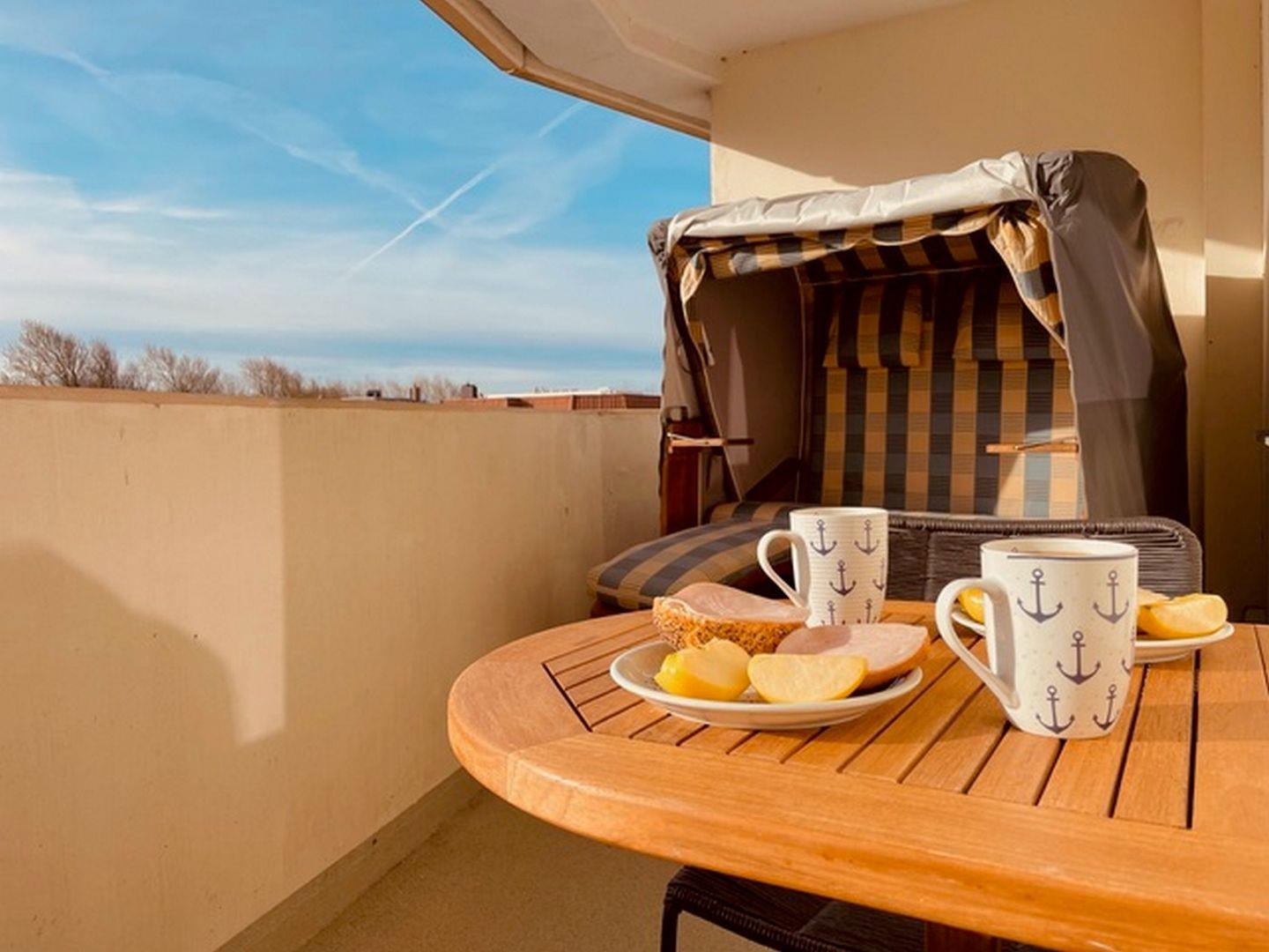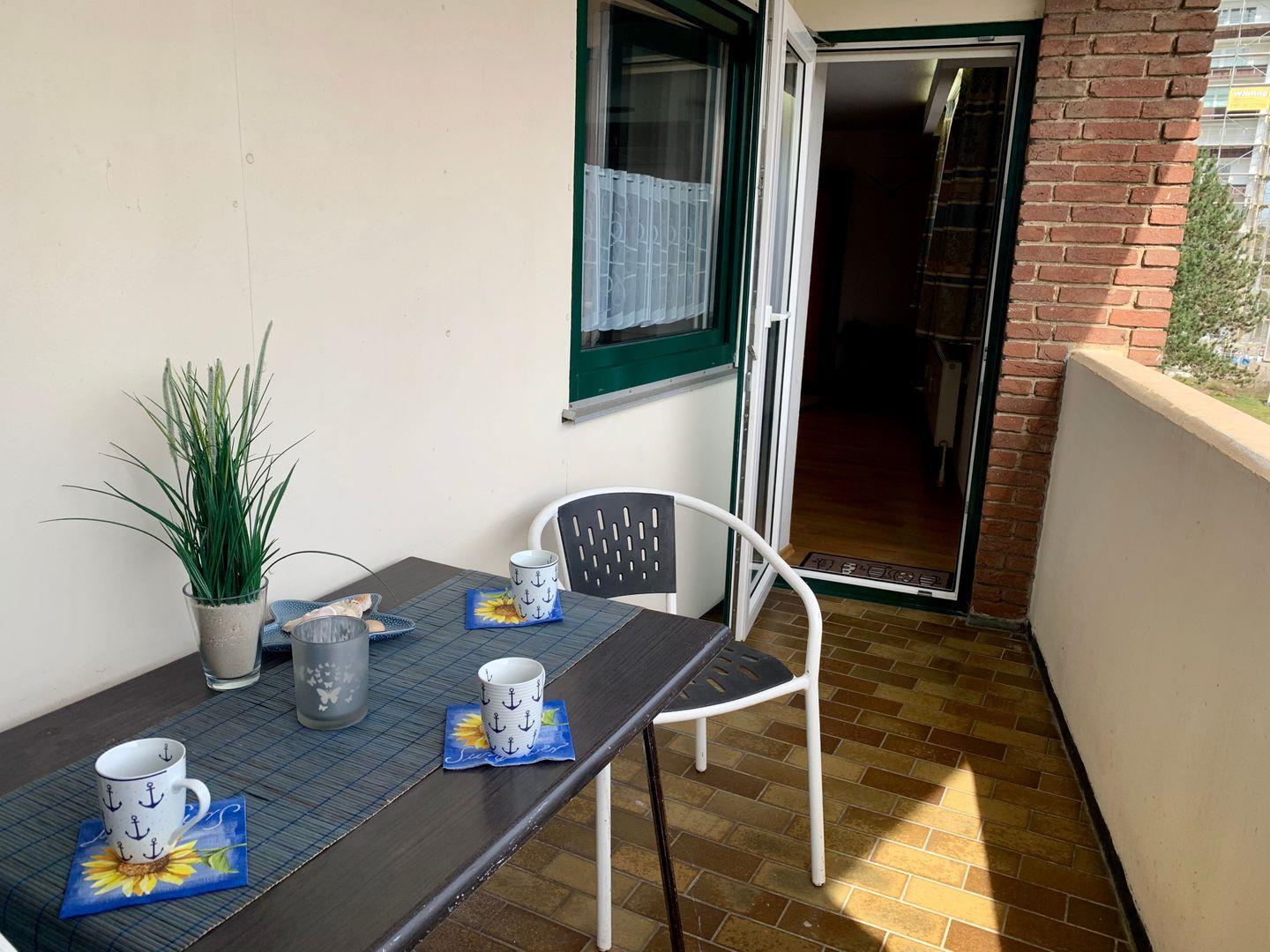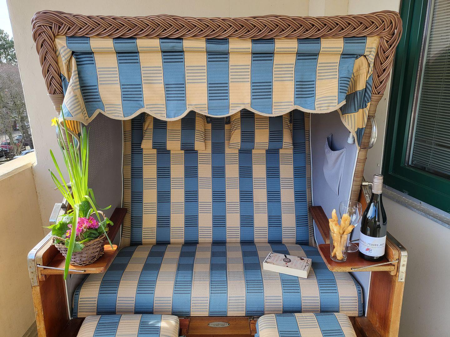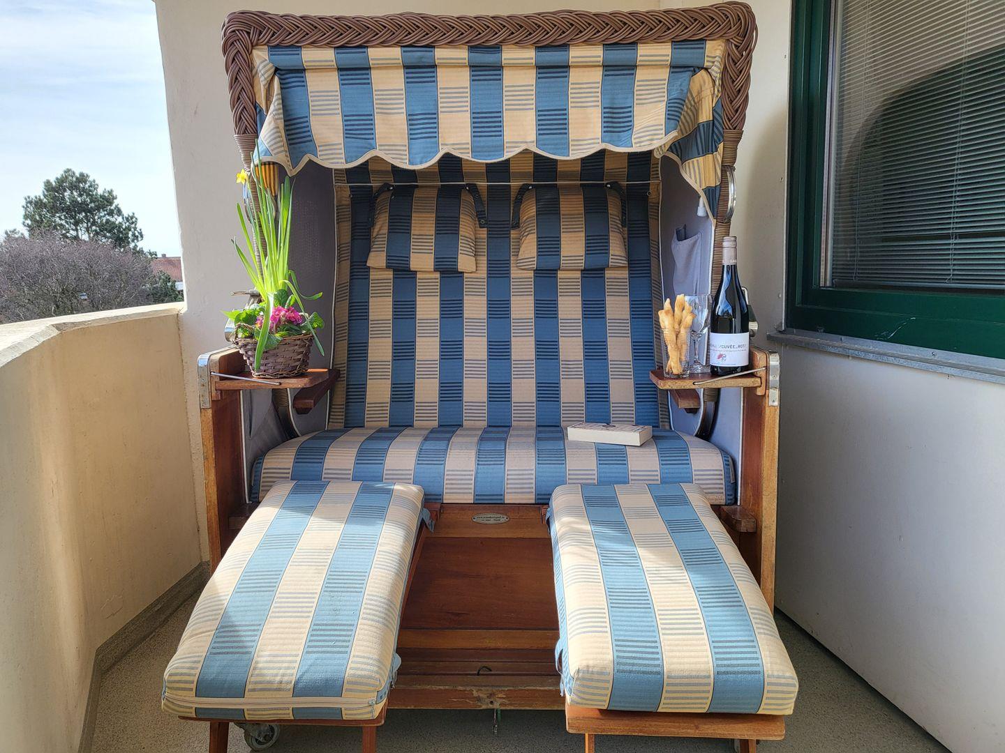 Neben dem Wohnraum liegt die größere Loggia der Ferienwohnung (mit Blick auf die Flaniermeile). Sie ist möbeliert und mit einem komfortablen Starndkorb ausgestattet.