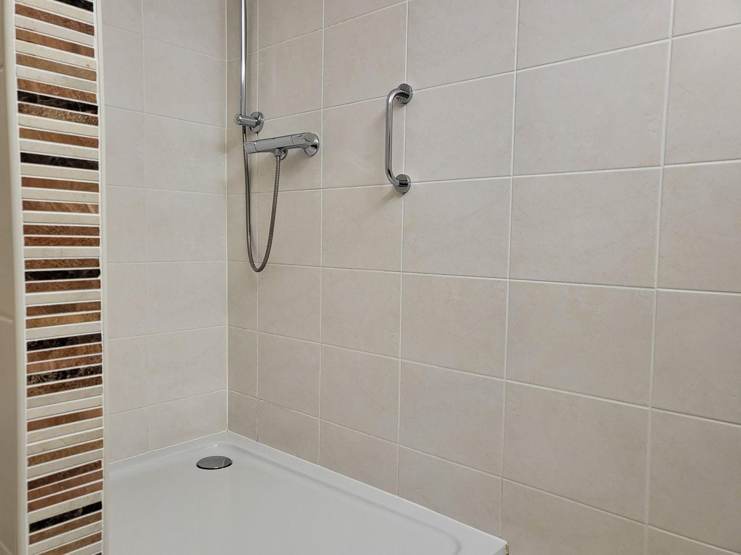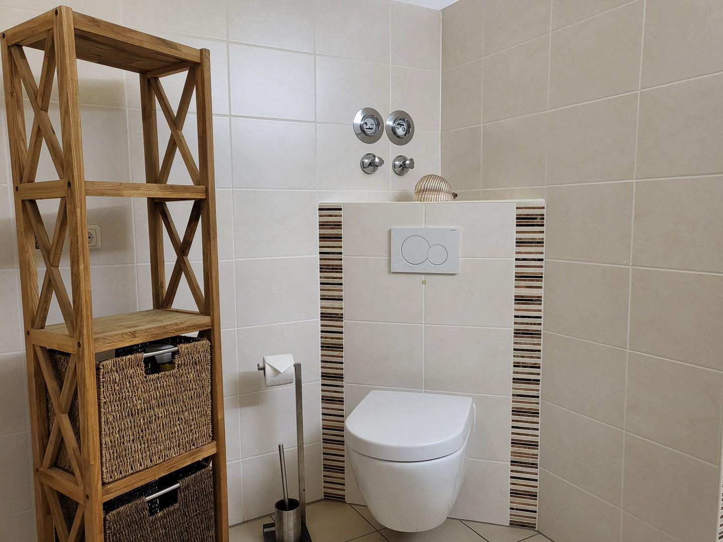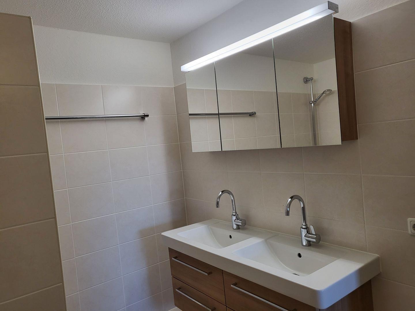 Die Wohnung hat ein Duschbad mit WC und Doppelwaschbecken. Die geräumige Dusche hat einen sehr niedrigen Einstieg und ist damit auch für mobilitätseingeschränkte Personen geeignet.