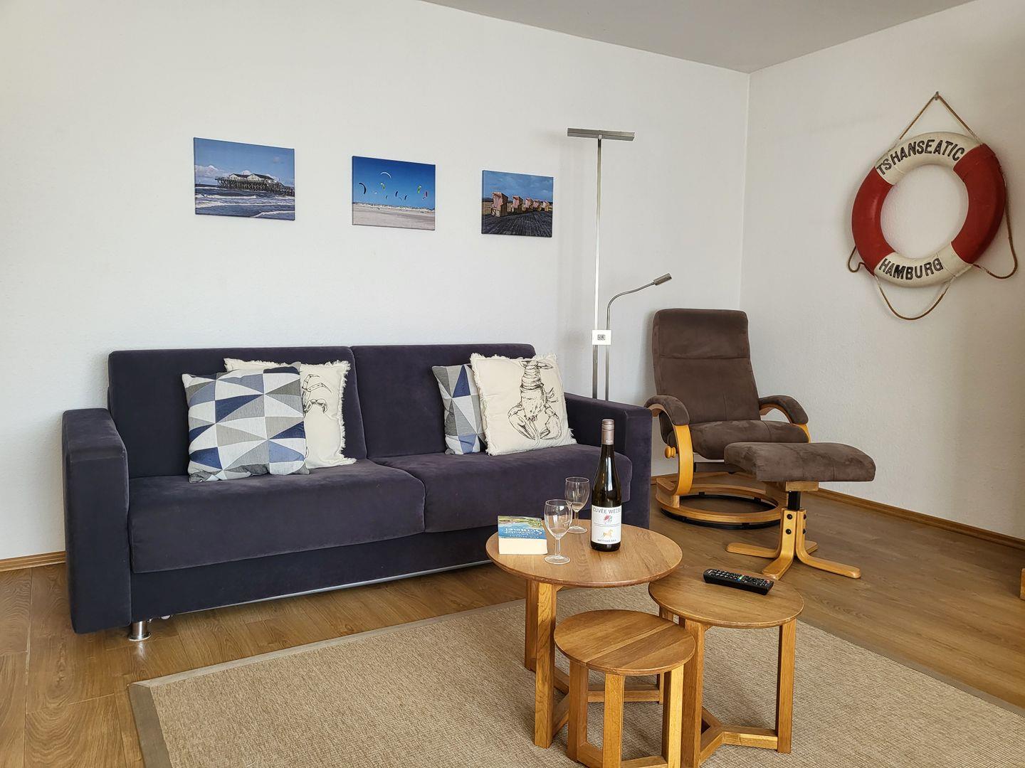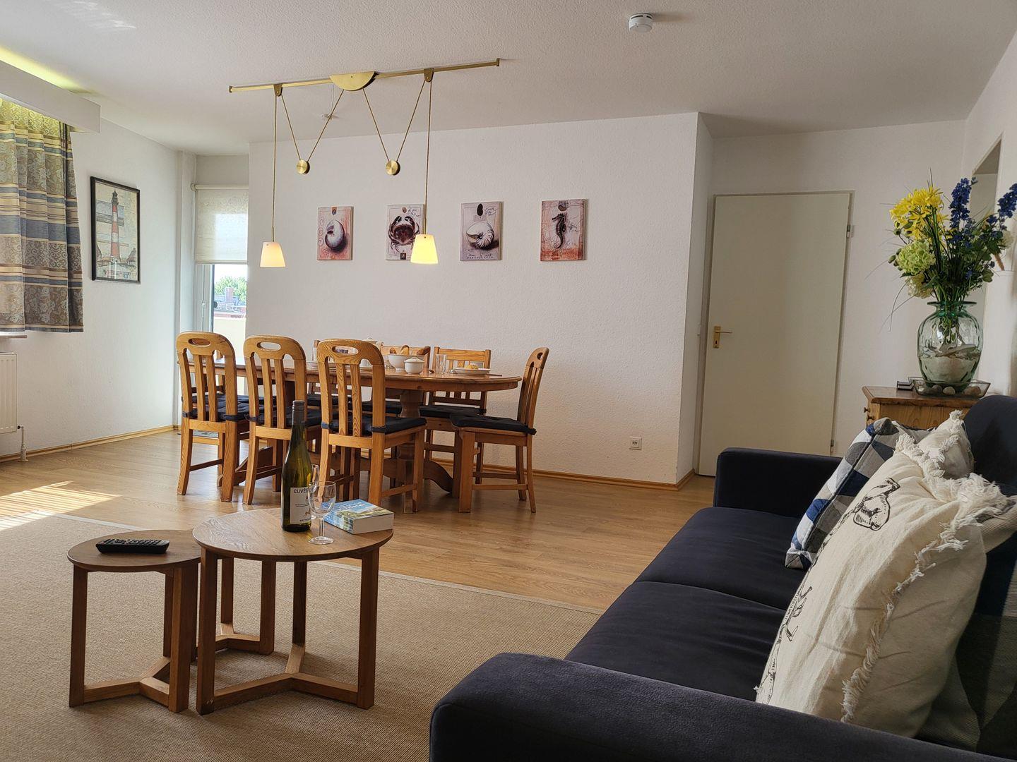 Der große Wohnraum ist modern und maritim eingerichtet. Er ist mit einer komfortablen Couch und einem Fernsehsessel ausgestattet. Der großzügige Esstisch bietet bis zu 8 Personen Platz.