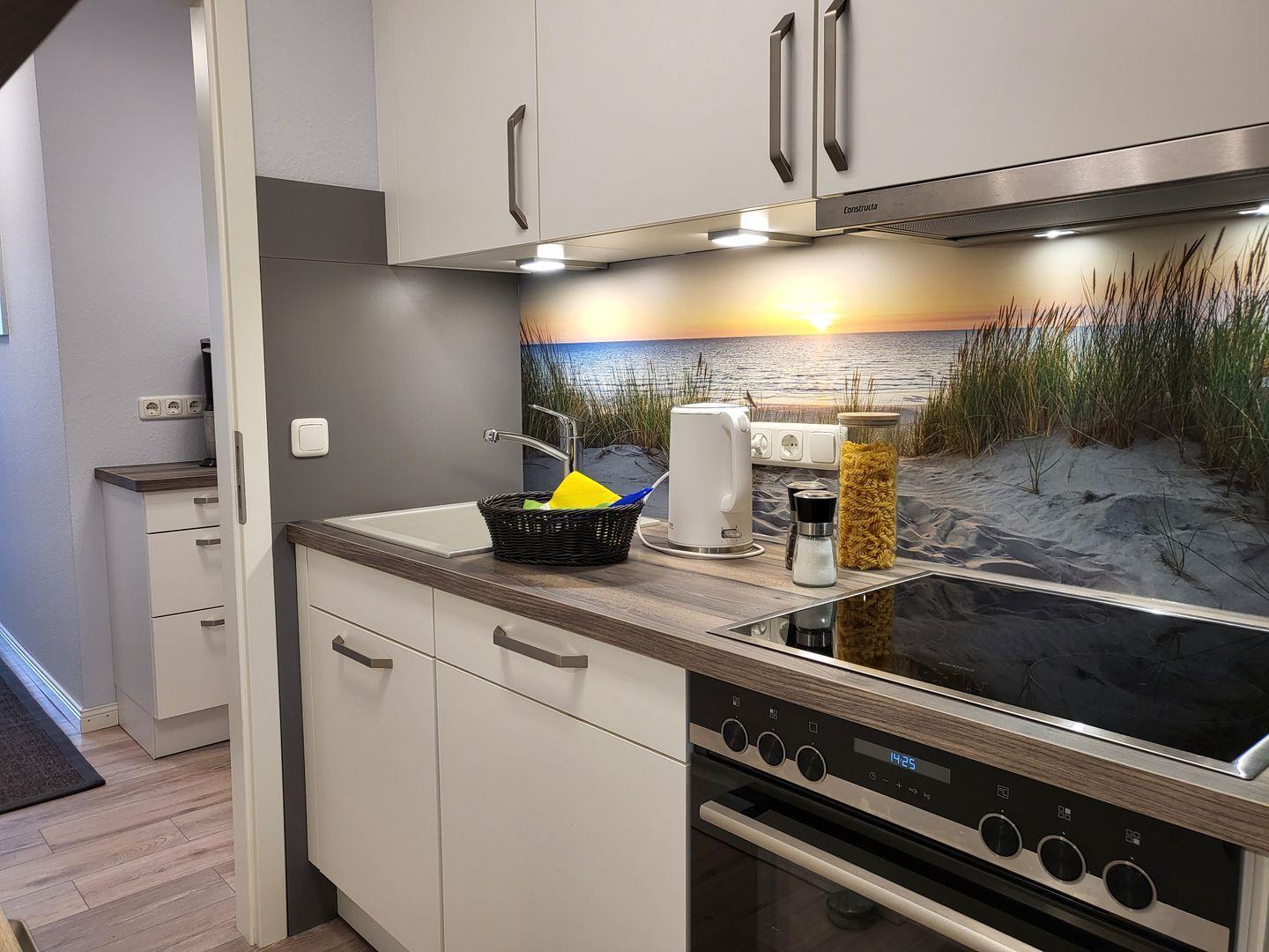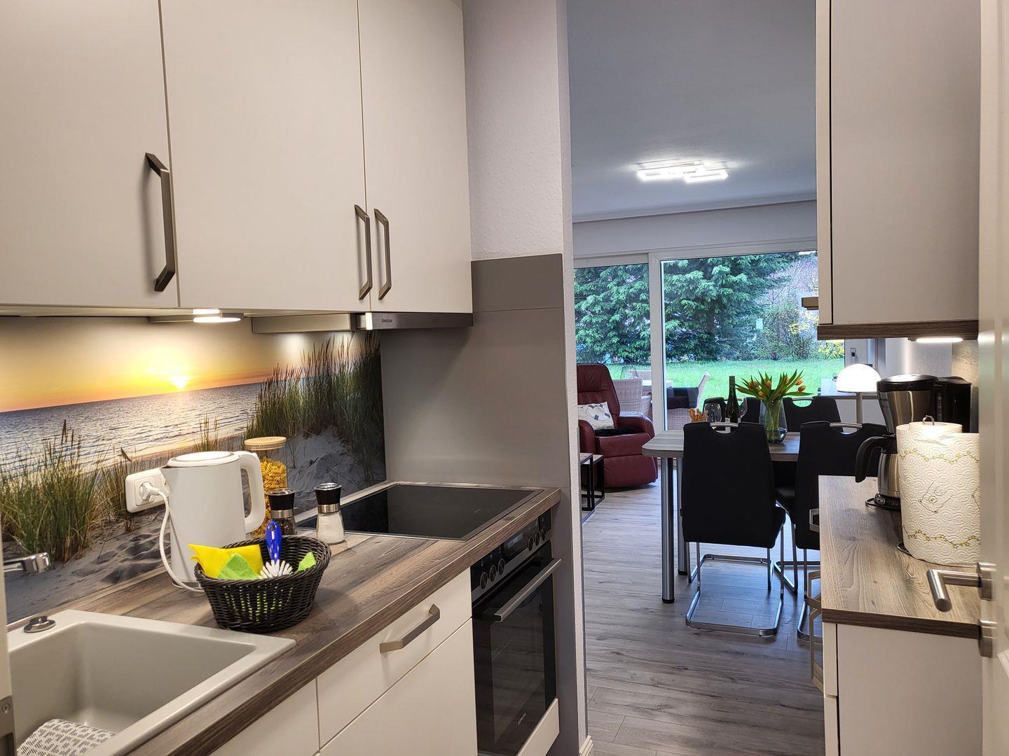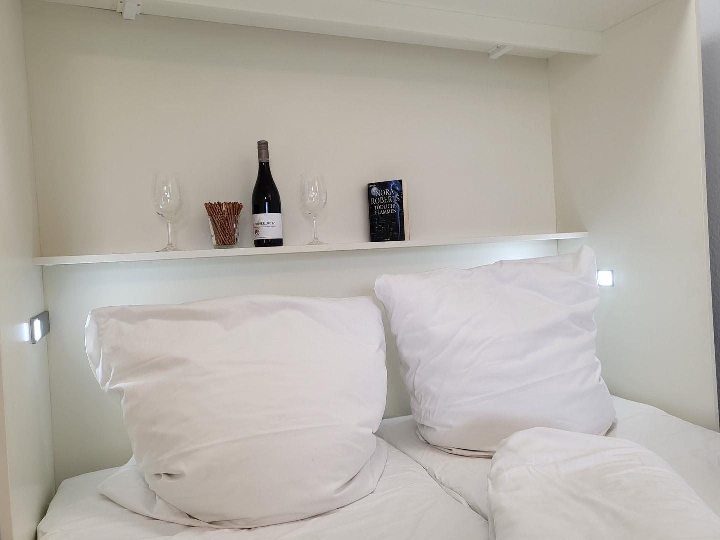 Durch den Übergang zur Terrasse und die große Fensterfront wirkt das modern eingerichtete Wohnzimmer hell und einladend. Zur Ausstattung gehören neben der komfortablen Couch noch zwei elektrisch verstellbare Leder-Relaxsessel und die einladend eingerichtete Essecke. Der 65" große Smart-TV ist frei schwenk- und kippbar, kostenfreies W-LAN ist vorhanden. Hier lässt es sich wunderbar entspannen. Platzsparend in den Raum integriert ist zudem das komfortable Schrankbett, dass zwei vollwertige Schlafmöglichkeiten bietet. Die angrenzende, offene Küche ist sehr gut eingerichtet und verfügt unter anderem über Cerankochfeld und Backwagen,Kühlschrank mit Gefrierfach sowie eine Kaffeemaschine. Es steht ein Sodastream zur Verfügung, Gäste bringen bitte Kartuschen mit blauem Endstück mit. Das separat gelegene Schlafzimmer ist mit zwei komfortablen Einzelbetten und einem Kleiderschrank ausgestattet, die Betten können problemlos zusammengeschoben werden. Im Flur gibt es weiteren Stauraum für Gepäck. Zur Ferienwohnung gehört ein Duschbad mit WC.