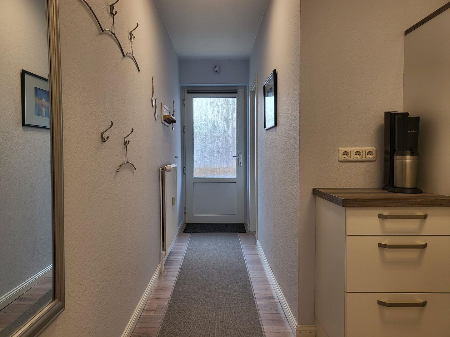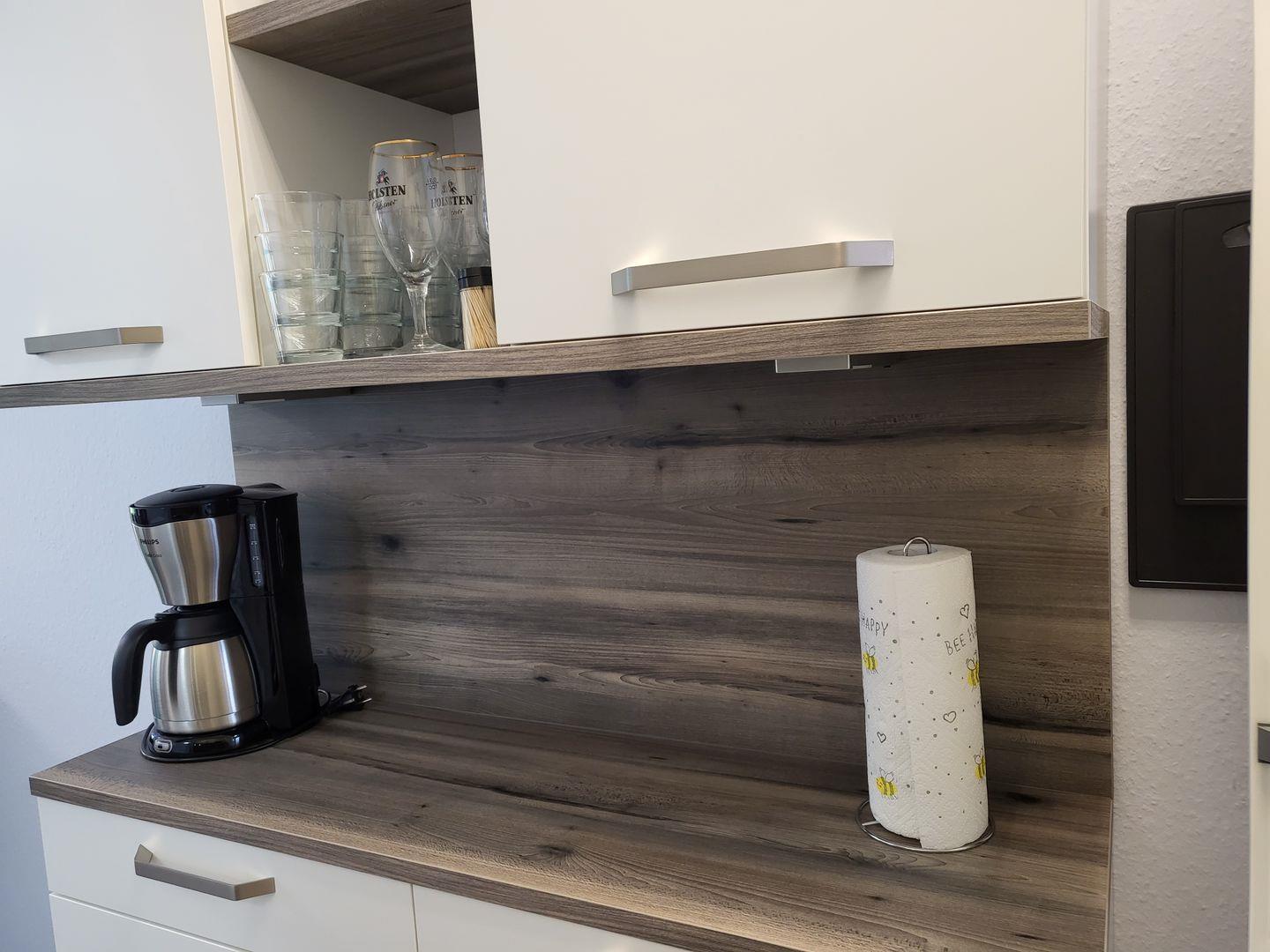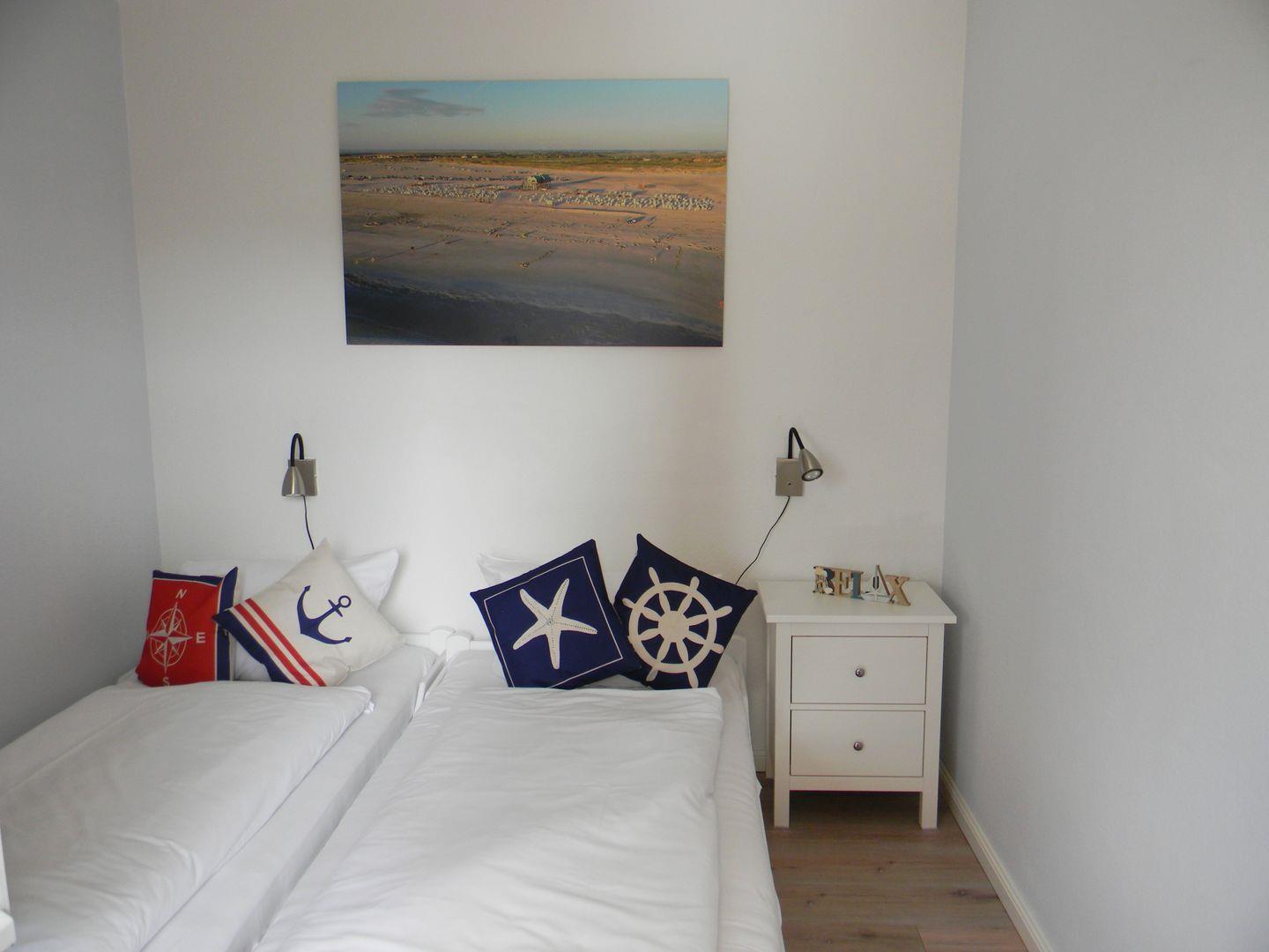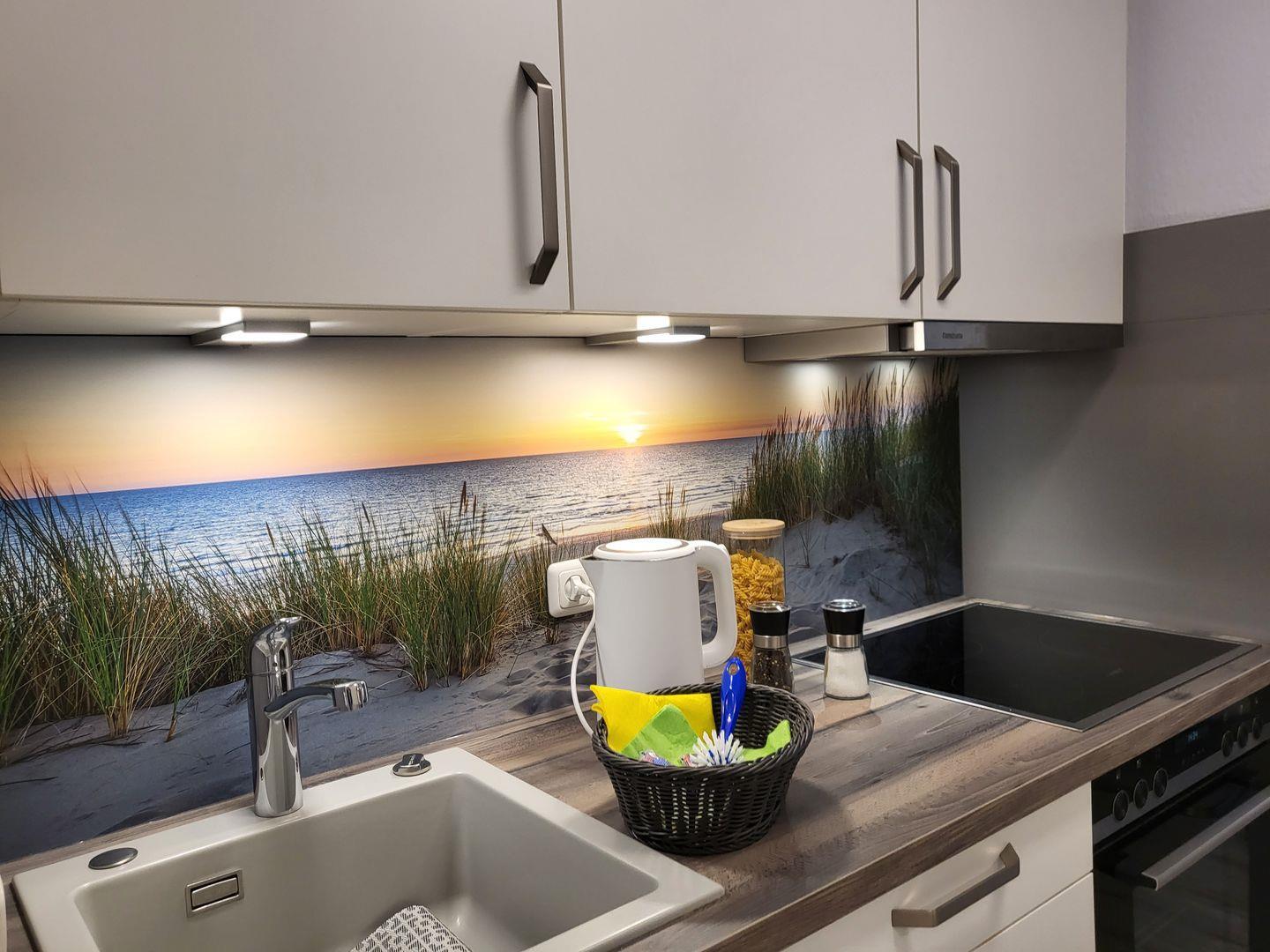 Durch den Übergang zur Terrasse und die große Fensterfront wirkt das modern eingerichtete Wohnzimmer hell und einladend. Zur Ausstattung gehören neben der komfortablen Couch noch zwei elektrisch verstellbare Leder-Relaxsessel und die einladend eingerichtete Essecke. Der 65" große Smart-TV ist frei schwenk- und kippbar, kostenfreies W-LAN ist vorhanden. Hier lässt es sich wunderbar entspannen. Platzsparend in den Raum integriert ist zudem das komfortable Schrankbett, dass zwei vollwertige Schlafmöglichkeiten bietet. Die angrenzende, offene Küche ist sehr gut eingerichtet und verfügt unter anderem über Cerankochfeld und Backwagen,Kühlschrank mit Gefrierfach sowie eine Kaffeemaschine. Es steht ein Sodastream zur Verfügung, Gäste bringen bitte Kartuschen mit blauem Endstück mit. Das separat gelegene Schlafzimmer ist mit zwei komfortablen Einzelbetten und einem Kleiderschrank ausgestattet, die Betten können problemlos zusammengeschoben werden. Im Flur gibt es weiteren Stauraum für Gepäck. Zur Ferienwohnung gehört ein Duschbad mit WC.