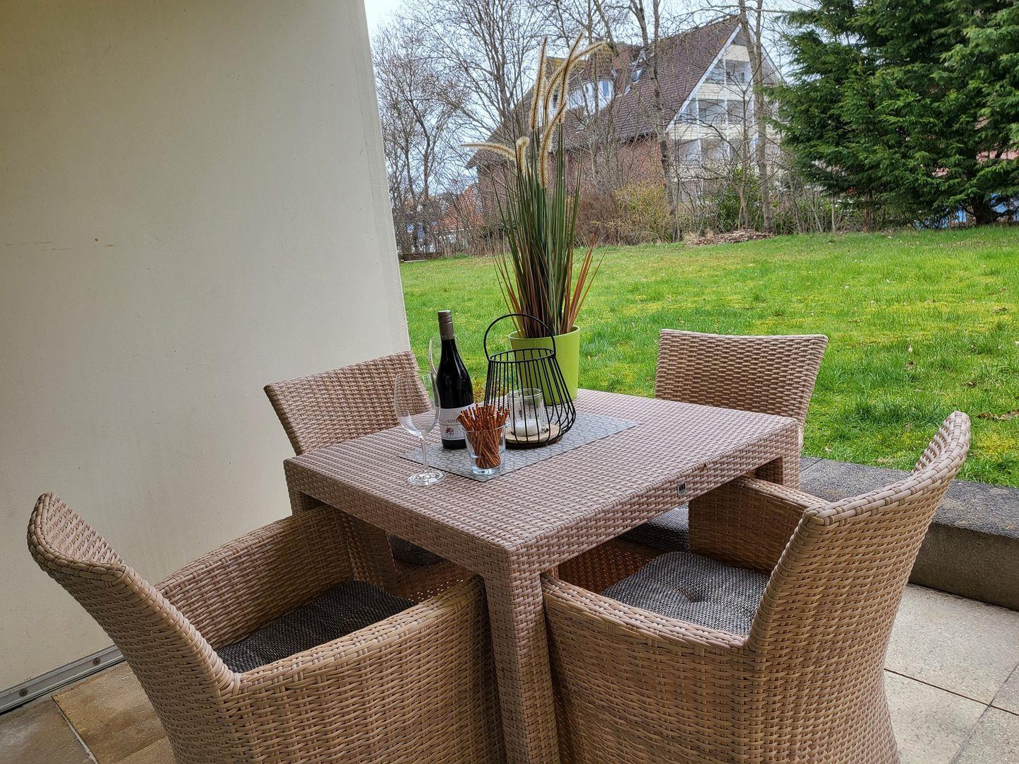 Zentrale 2 Zimmer Ferienwohnung für bis zu 4 Personen mit möblierter Terrasse.