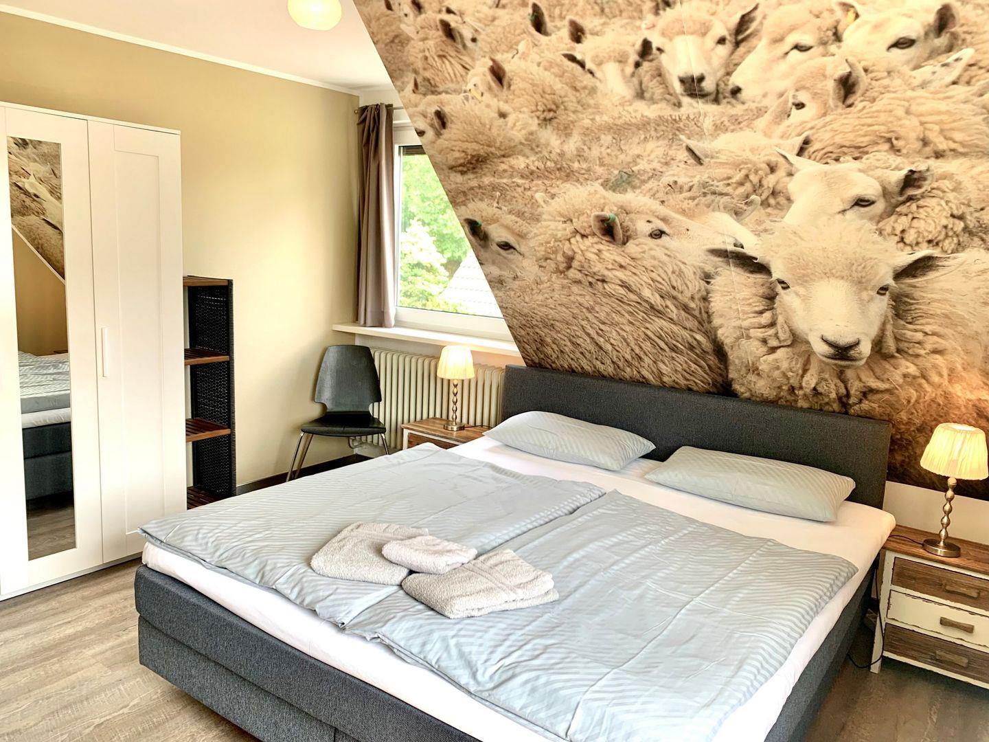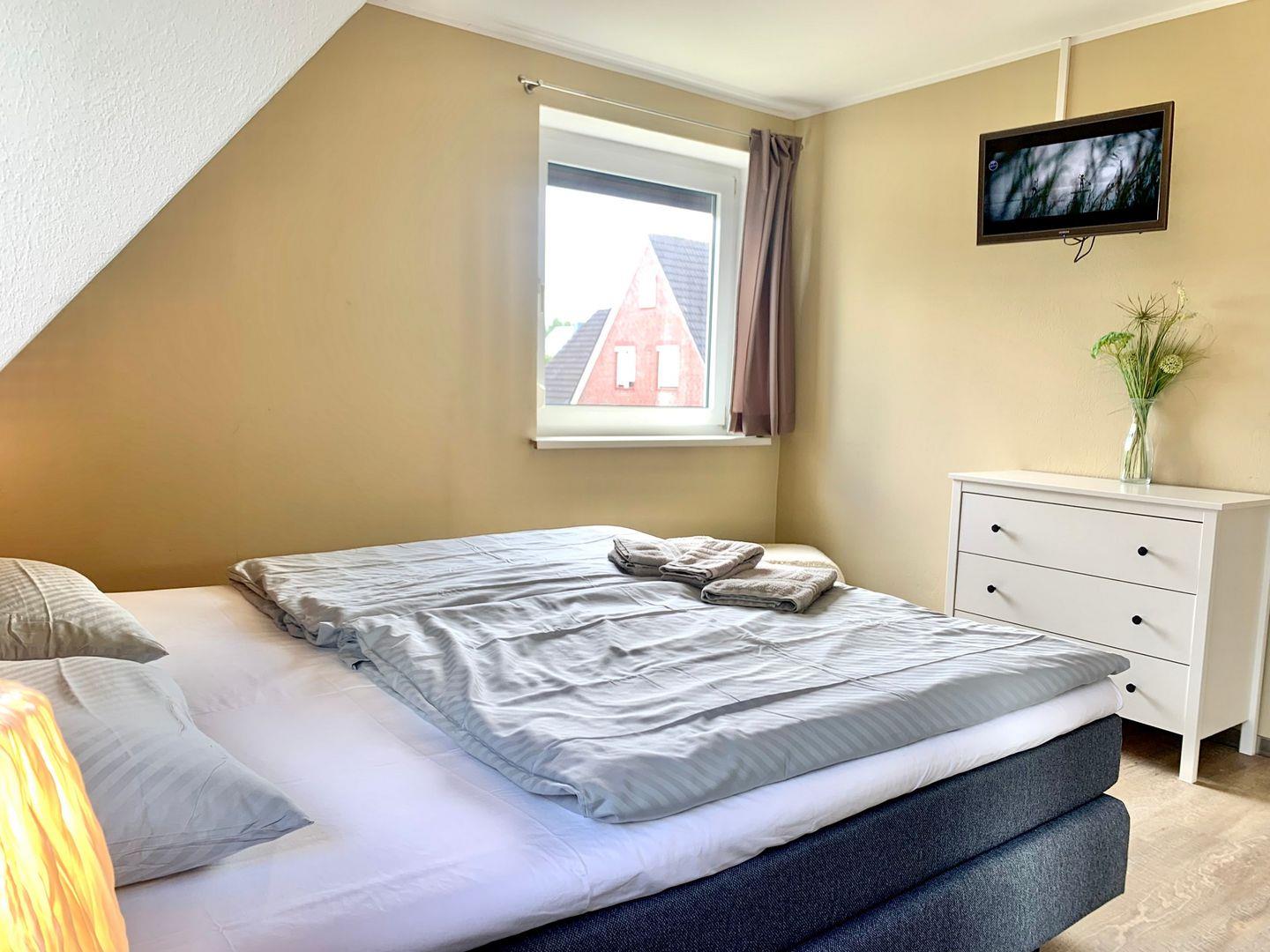 Zur Ferienwohnung gehören zwei geräumige Schlafzimmer. Eines ist ausgestattet mit großem 180x200cm Boxspringbett, im zweiten stehen zwei Einzelbetten bereit.