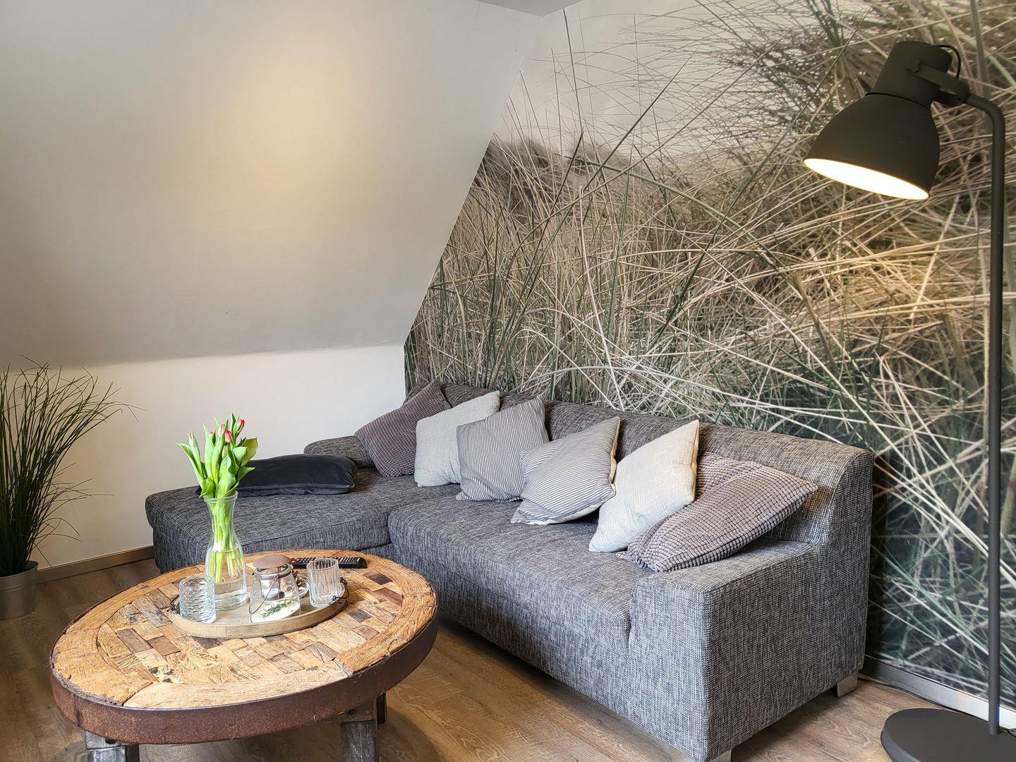 Im hellen, maritim eingerichteten Wohnzimmer bietet eine gemütliche Couchgarnitur eine tolle Grundlage für gemütliche Stunden.