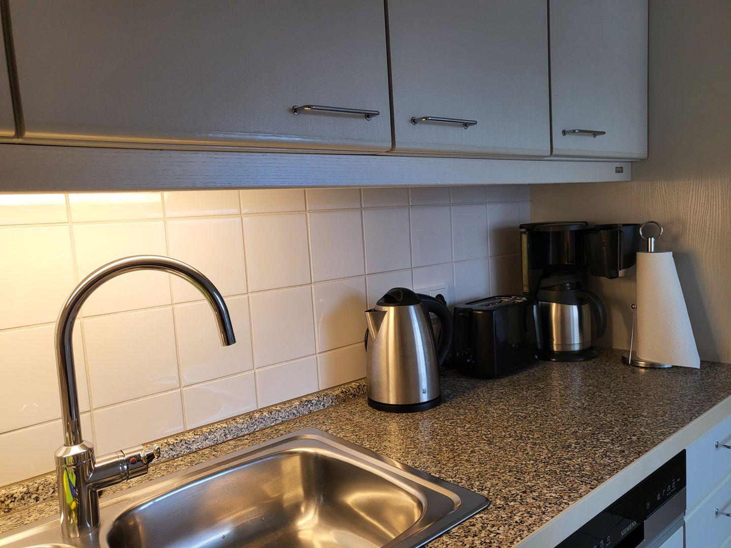 Hier gehören unter anderem Cerankochfeld und Backofen, ein Kühlschrank mit Gefrierfach sowie Geschirrspüler und Kaffeemaschine zur Ausstattung.