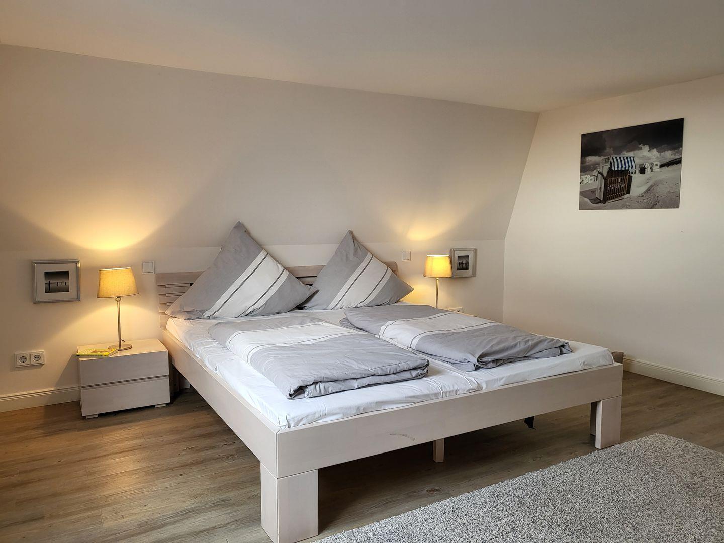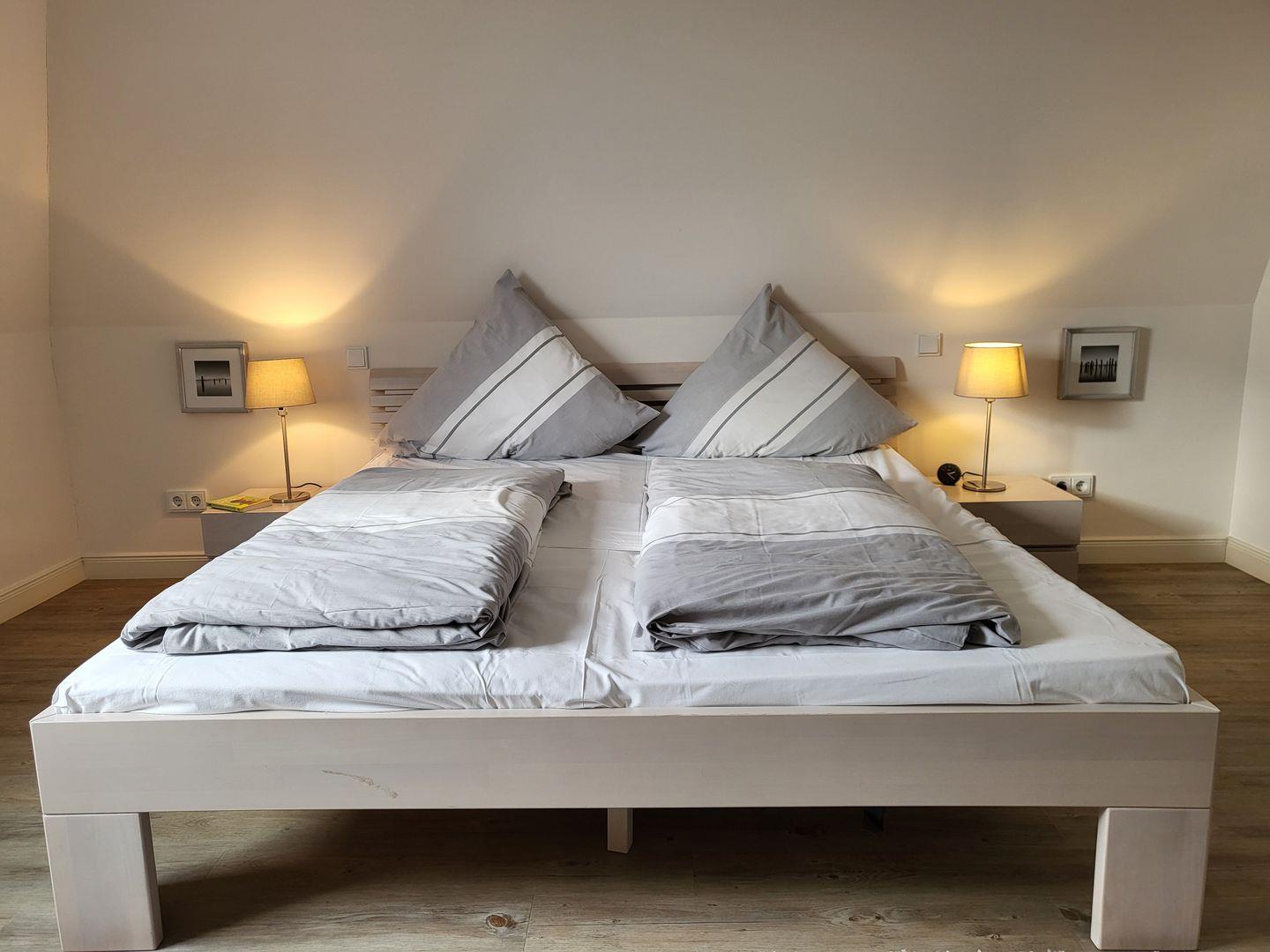Im Dachgeschoss stehen zwei Schlafzimmer zur Verfügung. Beide sind mit 180x200cm Doppelbetten ausgestattet und bieten Stauraum in Kleiderschränken.