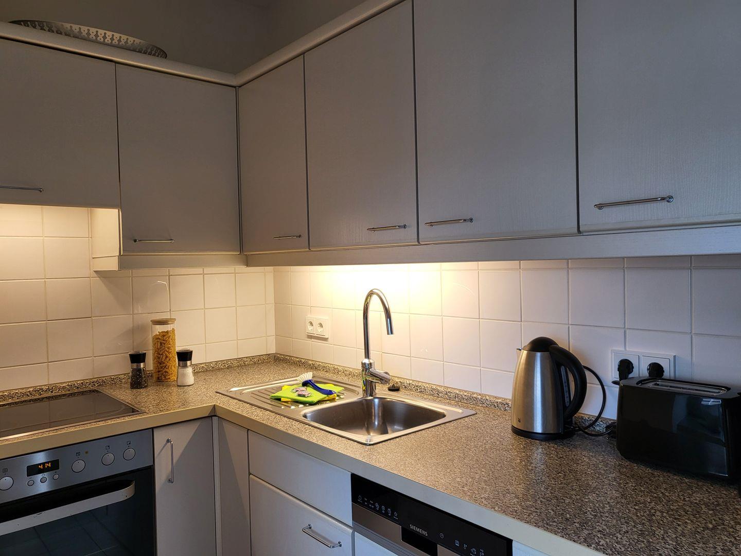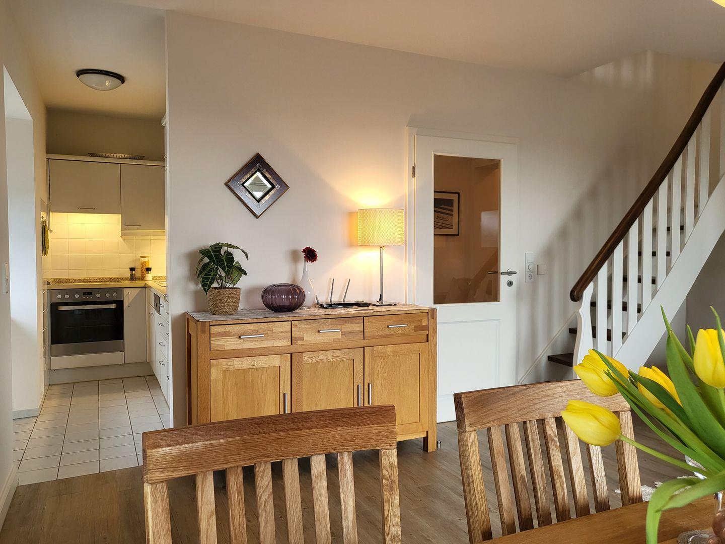 Angrenzend liegt die gut ausgestattete offene Küche der Ferienwohnung.