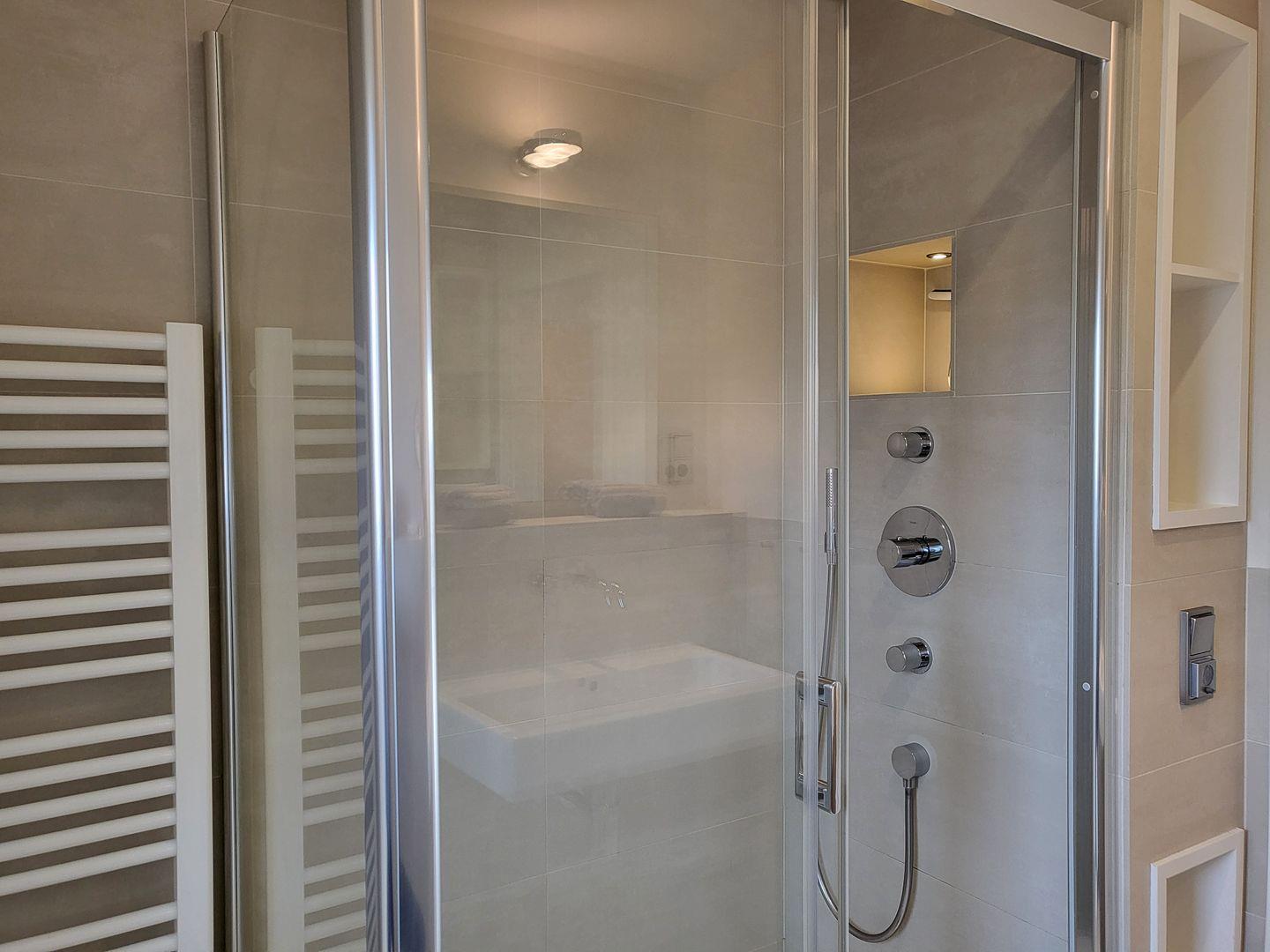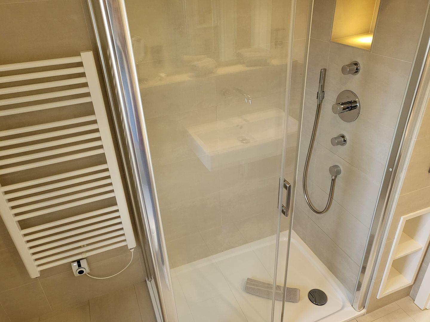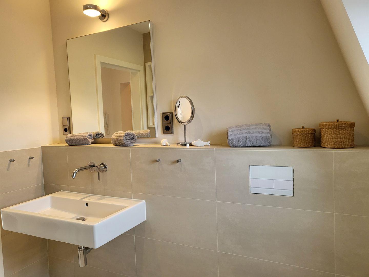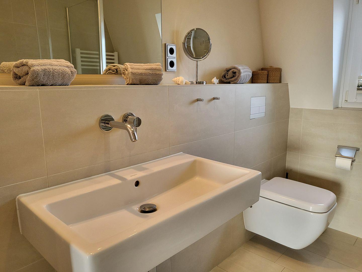Ein modernes, helles Duschbad mit bodengleicher Dusche und Fußbodenheizung gehört ebenfalls zur Ferienwohnung.
