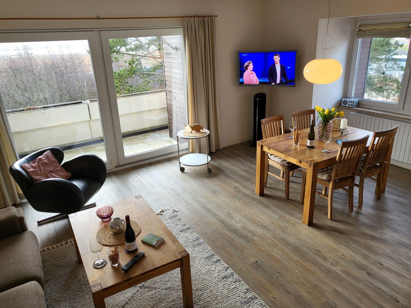 Moderne 3-Zimmer Ferienwohnung mit Balkon und Seeblick in St. Peter-Ording, ideal für Familienurlaub nahe Strand und Ortszentrum.