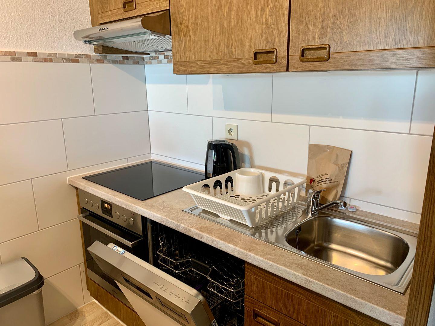 Die Küche ist vollumfassend ausgestattet mit Ceranfeld, Ofen, Geschirrspüler, Kühlschrank, Mikrowelle, Kaffeemaschine und Wasserkocher.