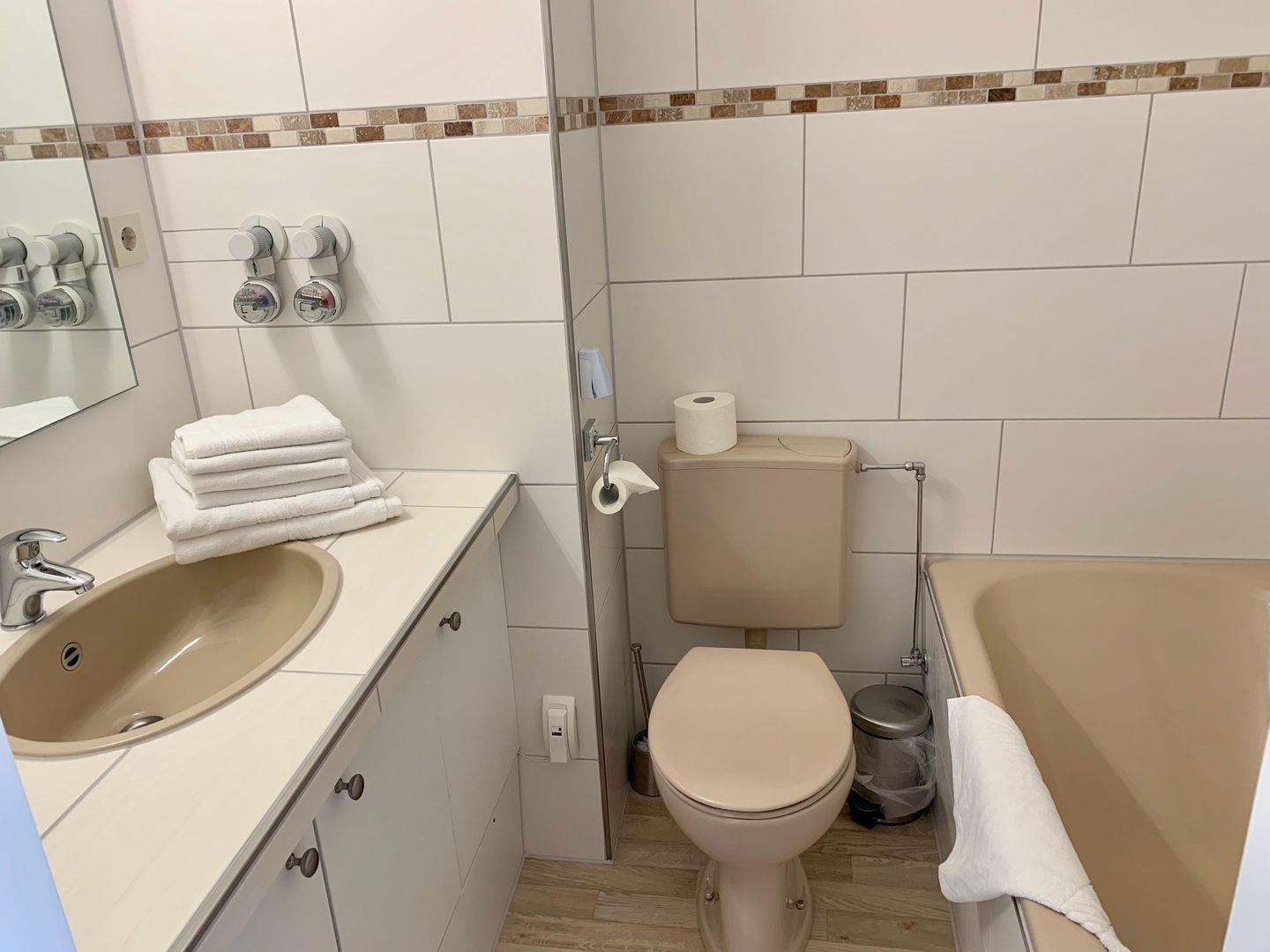 Das Badezimmer der sehr zentral gelegenen Ferienwohnung bietet Badewanne und WC.