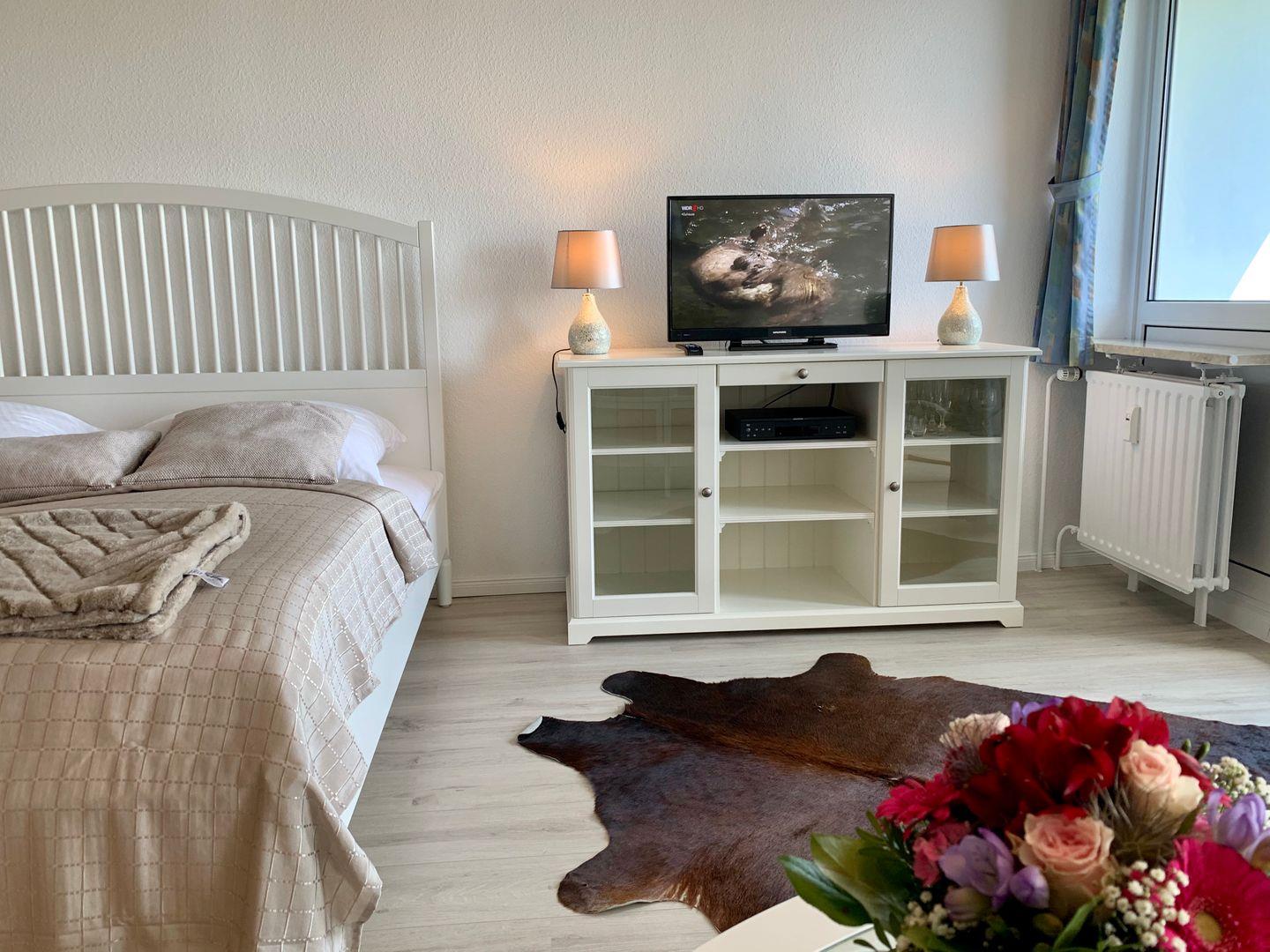 Der modern eingerichtete Wohn- und Schlafraum vereint komfortable, edle und praktische Einrichtung zu einem angenehmen, hellen Ambiente. Komfortables Doppelbett mit Federkernmatratze sowie gemütliche Sitzgelegenheiten und Essbereich machen das Wohnzimmer multifunktional. Ein großer Flachbild-TV steht bereit. Es steht kostenfreies W-LAN zur Verfügung. Über einen kleinen Tresen ist die gut ausgestattete Küchenzeile mit dem Wohnraum verbunden.